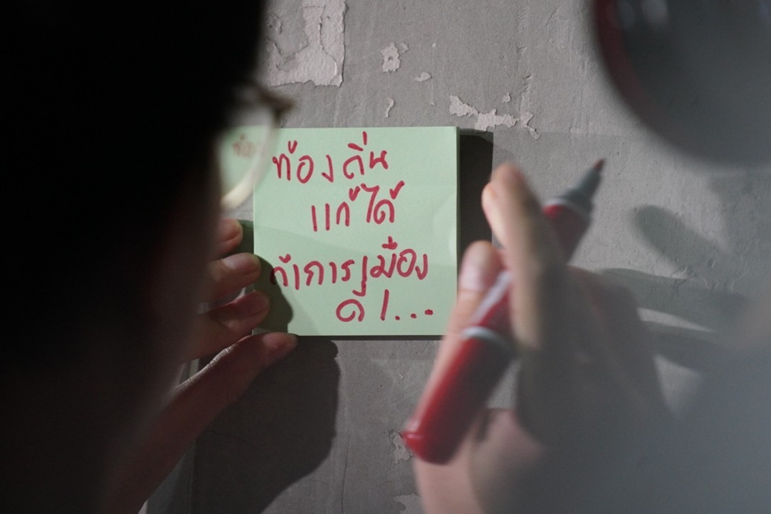 คณะราษฎร์บอมบ์ ชุมนุมอนุสาวรีย์ชัยสมรภูมิ จัดกิจกรรมเขียนโพสต์อิทติดเสาตอม่อ เรียกร้องรัฐบาลแก้ไขรธน. กระจายอำนาจสู่ท้องถิ่น