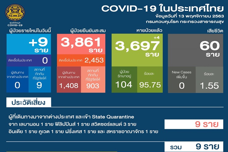 เมื่อวันที่ 13 พ.ย. 63 ศูนย์บริหารสถานการณ์โควิด-19 (ศบค.) รายงานสถานการณ์การแพร่ระบาดของไวรัสโควิด-19 ในประเทศประจำวันดังนี้