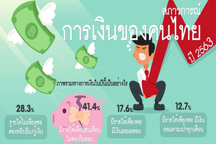 ภาพรวมทางการเงินของคนไทยในปีนี้ ร้อยละ 41.4 ระบุว่า มีรายได้แบบเดือนชนเดือน ไม่พอเก็บออม รองลงมาร้อยละ 28.3 ระบุว่า มีรายได้ไม่เพียงพอต้องหยิบยืม/กู้เงิน และร้อยละ 17.6 ระบุว่า มีรายได้เพียงพอ แต่มีเงินออมลดลง