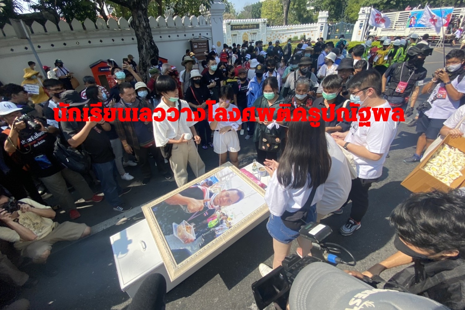 นักเรียนเลววางโลงศพจำลองณัฐพล-ติดสติกเกอร์หมุดคณะราษฎรรอบกำแพงศธ.
