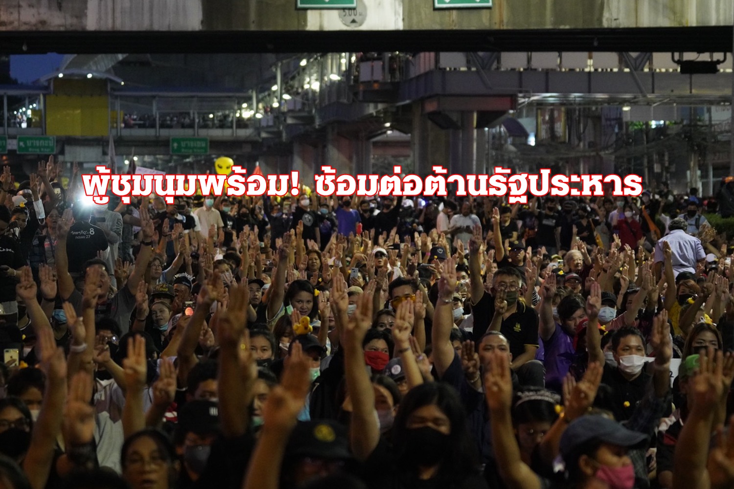 ม็อบราษฎรร้องเพลงชาติ ชู3นิ้วพร้อมซ้อมต้านรัฐประหาร