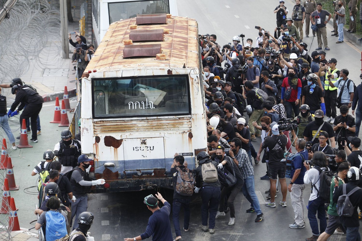 การ์ดราษฎรดันรถบัสพ้นทางเข้ากรมทหารราบที่11 รอม็อบเคลื่อนมา