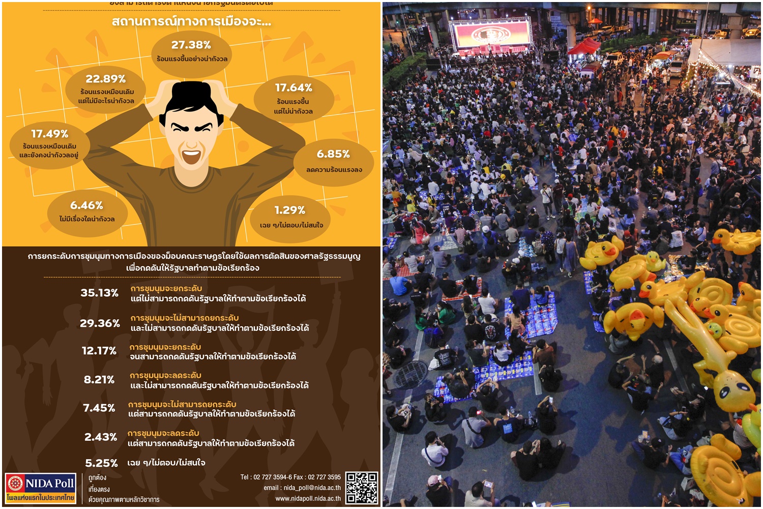 นิด้าโพลเผยนายกฯรอดปมพักบ้านหลวงทำสถานการณ์การเมืองร้อนแรงขึ้น คาดม็อบราษฎรยกระดับการชุมนุมแต่ไม่สามารถกดดันรัฐบาลให้ทำตามข้อเรียกร้องได้