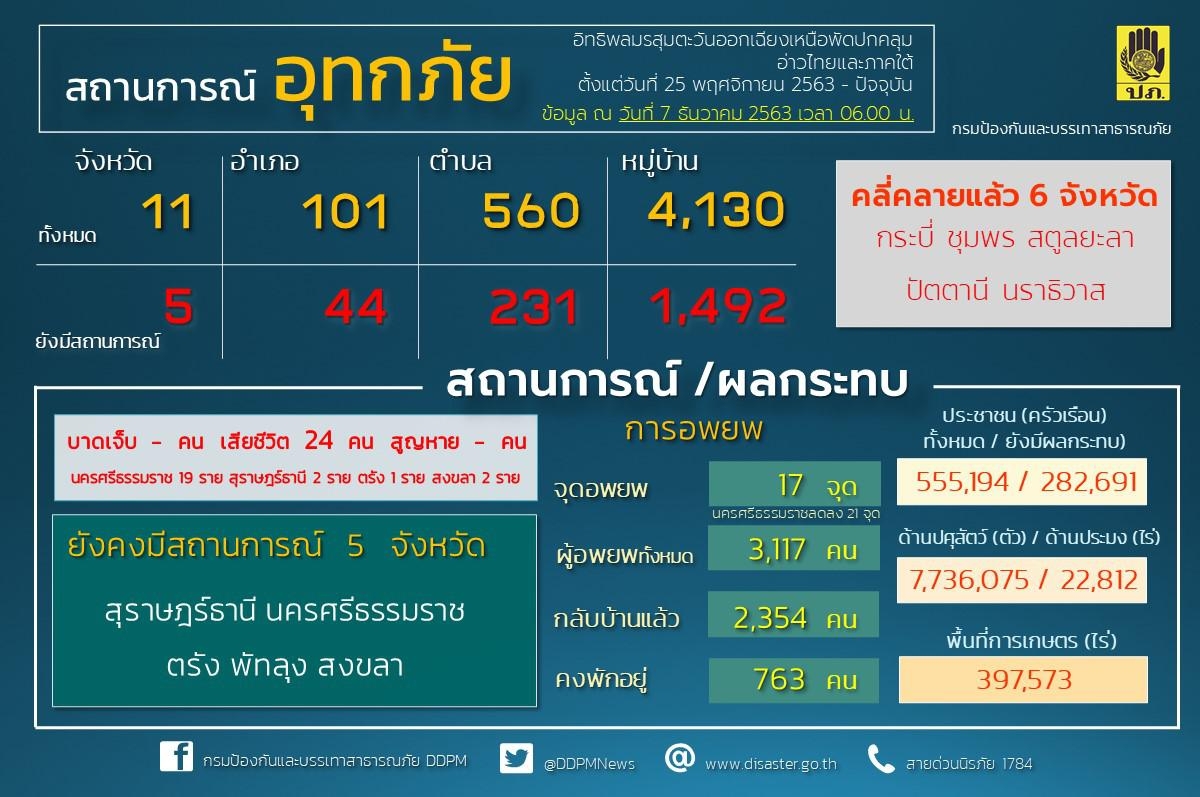 เมื่อวันที่ 7 ธ.ค.กรมป้องกันและบรรเทาสาธารณภัย (ปภ.) กระทรวงมหาดไทย รายงานสถานการณ์น้ำท่วมฉับพลัน น้ำไหลหลาก และวาตภัยในพื้นที่ภาคใต้ 11 จังหวัด 101 อำเภอ 560 ตำบล 4,130 หมู่บ้าน ประชาชนได้รับผลกระทบ 555,194 ครัวเรือน ผู้เสียชีวิต 24 ราย ปัจจุบัน ยังคงมีสถานการณ์น้ำท่วมขังใน 5 จังหวัด ได้แก่ สุราษฎร์ธานี นครศรีธรรมราช ตรัง พัทลุง และสงขลา ระดับน้ำลดลงทุกจังหวัด ทั้งนี้ ปภ. ได้ร่วมกับหน่วยทหาร จังหวัด และหน่วยงานที่เกี่ยวข้อง เร่งให้การช่วยเหลือผู้ประสบภัยและคลี่คลายสถานการณ์ โดยเร่งระบายน้ำออกจากพื้นที่น้ำท่วมและสำรวจความเสียหายครอบคลุมทุกด้าน