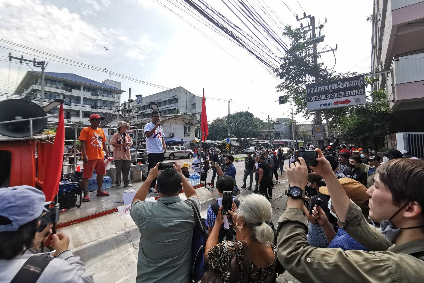 มวลชนรวมตัวสภ.นนทบุรี ให้กำลังใจแกนนำราษฎรเข้ารับทราบข้อกล่าวหาม.112