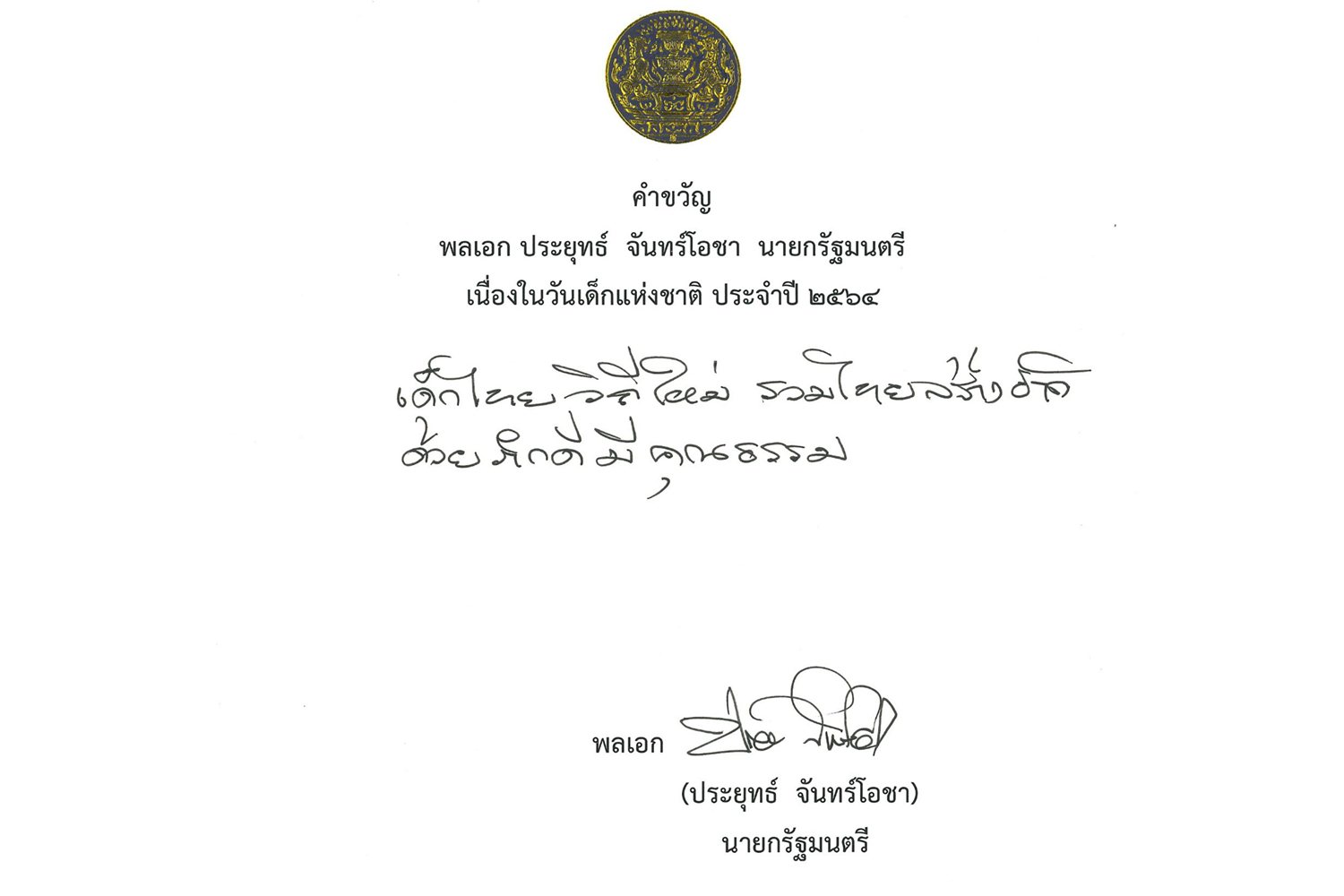 นายกรัฐมนตรี มอบคำขวัญวันเด็กแห่งชาติ ประจำปี 2564 "เด็กไทยวิถีใหม่ รวมไทยสร้างชาติ ด้วยภักดีมีคุณธรรม"