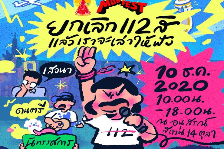 1. แฟนเพจเฟซบุ๊ก แนวร่วมธรรมศาสตร์และการชุมนุม – United Front of Thammasat and Demonstration ระบุว่า แนวร่วมธรรมศาสตร์ฯ x Mob Fest ขอเชิญทุกท่านเข้าร่วมงาน “ยกเลิก112 สิ แล้วเราจะเล่าให้ฟัง” ณ อนุสรณ์สถาน 14 ตุลา ตั้งแต่เวลา 10.00-18.00 น. พบกับวงเสวนาวิชาการ นิทรรศการม.112 วงดนตรี ปาฐกถา และบูธต่าง ๆ มากมาย