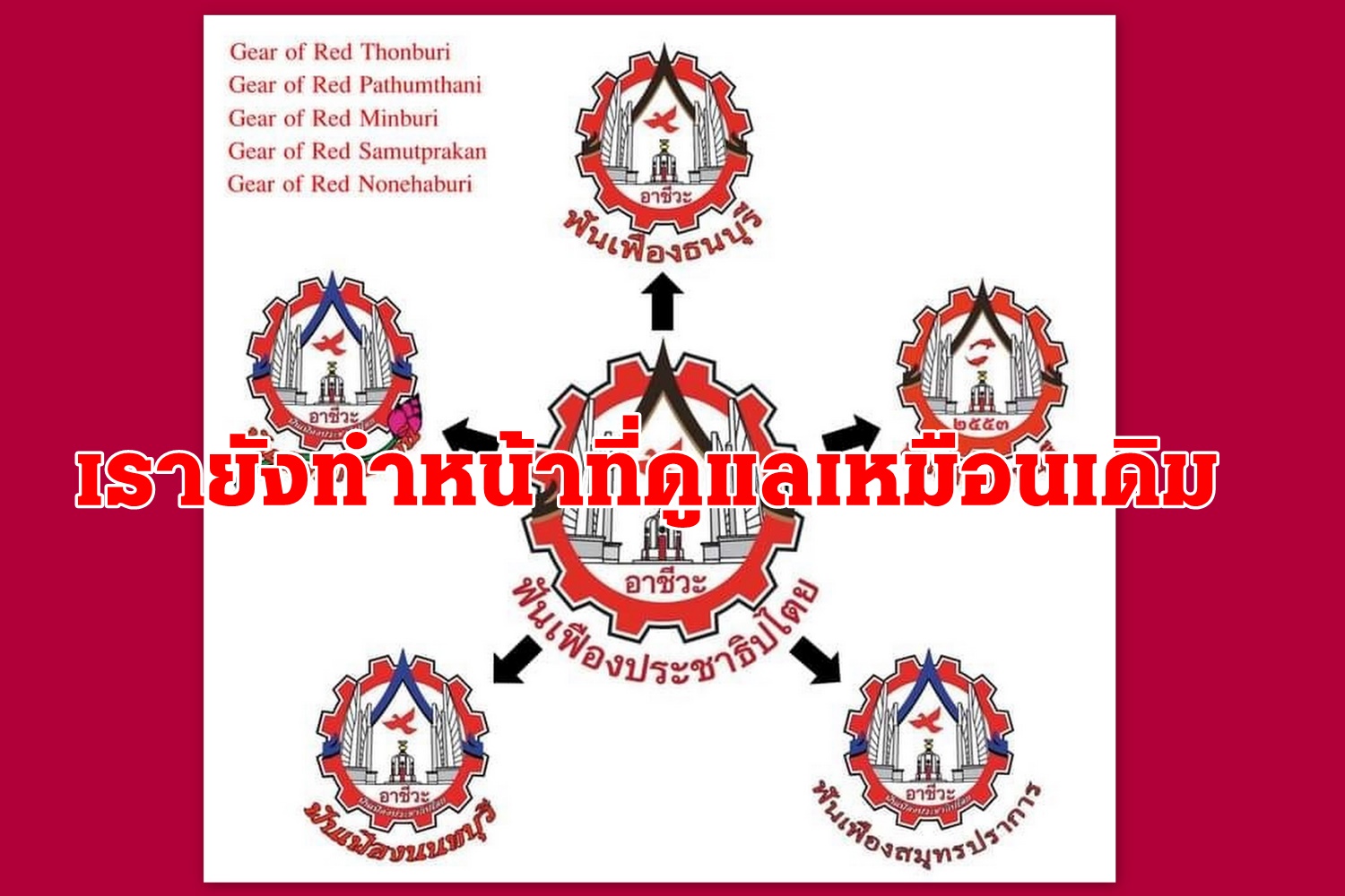 “ตอนนี้แกนนำได้ประกาศยกเลิกการ์ดภาคีทั้งหมดแล้ว มวลชนไม่ต้องตกใจ #ฟันเฟือง ไม่ได้เป็นการ์ดภาคีอยู่แล้ว #ฟันเฟือง ก็เหมือนมวลชน แต่เรามีหน้าที่ เพราะเราเป็นองครักษ์อาชีวะของประชาชน ค่อยดูแลและคอยเก็บขยะตามชุมนุมเหมือนเดิมครับ ยังเจอพวกเราอยู่จนสงครามการเมืองครั้งนี้จบลงครับ ทุกฟันเฟือนเสมือนหนึ่งซึ่งพี่น้อง เหล่ามวลชนอุ่นใจเมื่อได้เห็น ทั้งกายทั้งใจฟันเฟืองที่ร่วมเป็น อุทิศตนเสียสละเพื่อบ้านเมือง #ฟันเฟืองประชาธิปไตย”