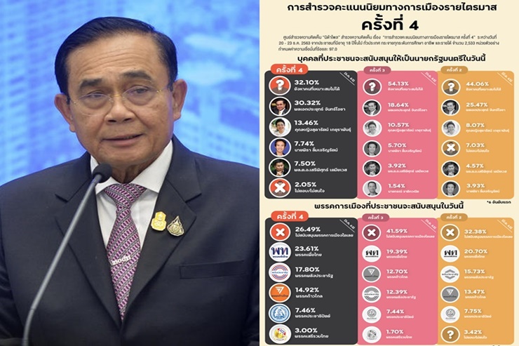 ศูนย์สำรวจความคิดเห็น “นิด้าโพล” สถาบันบัณฑิตพัฒนบริหารศาสตร์ (นิด้า) เปิดเผยผลสำรวจของประชาชน เรื่อง “การสำรวจคะแนนนิยมทางการเมืองรายไตรมาส ครั้งที่ 4” ทำการสำรวจระหว่างวันที่ 20 – 23 ธันวาคม 2563 จากประชาชนที่มีอายุ 18 ปีขึ้นไป กระจายทุกภูมิภาค ระดับการศึกษา และอาชีพทั่วประเทศ รวมทั้งสิ้น จำนวน 2,533 หน่วยตัวอย่าง