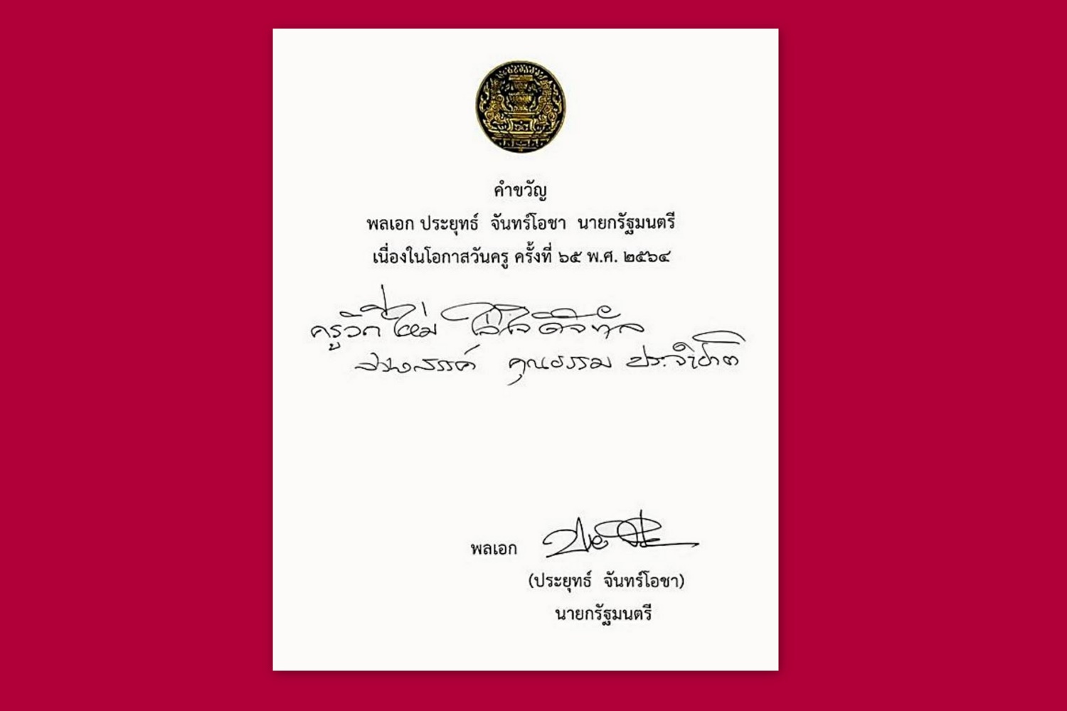 น.ส.ไตรศุลี ไตรสรณกุล รองโฆษกประจำสำนักนายกฯ โพสเฟซบุ๊กเผยแพร่คำขวัญวันครูของ พล.อ.ประยุทธ์ จันทร์โอชา นายกฯ และรมว.กลาโหม โดยระบุว่า นายกฯ มอบคำขวัญ เนื่องในโอกาสวันครู ครั้งที่ 65 พ.ศ.2564 ความว่า