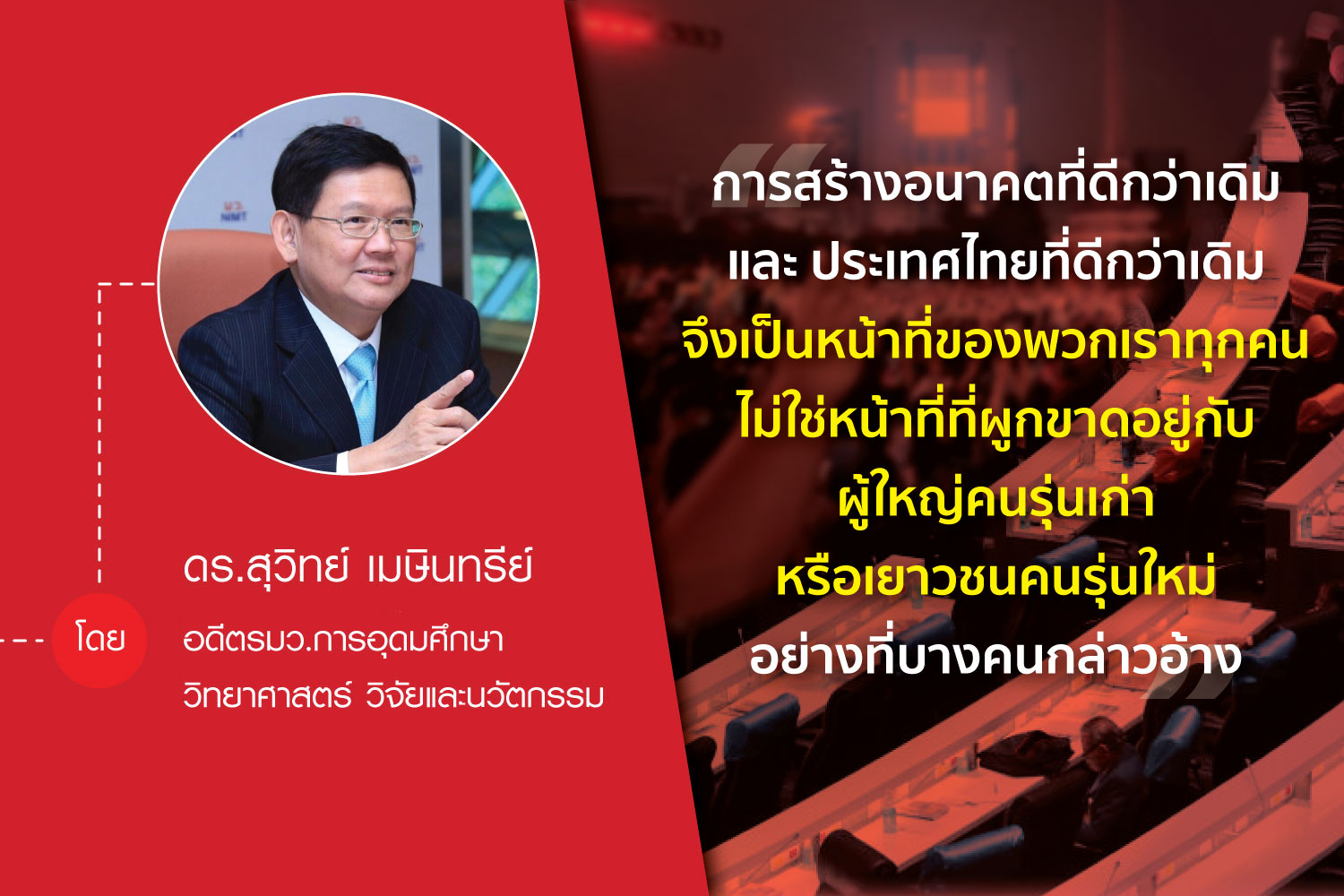 ดังนั้น การสร้างอนาคตที่ดีกว่าเดิม และ ประเทศไทยที่ดีกว่าเดิม จึงเป็นหน้าที่ของ “พวกเรา” ทุกคน ไม่ใช่หน้าที่ที่ผูกขาดอยู่กับ “ผู้ใหญ่คนรุ่นเก่า” หรือ “เยาวชนคนรุ่นใหม่” อย่างที่บางคนกล่าวอ้าง