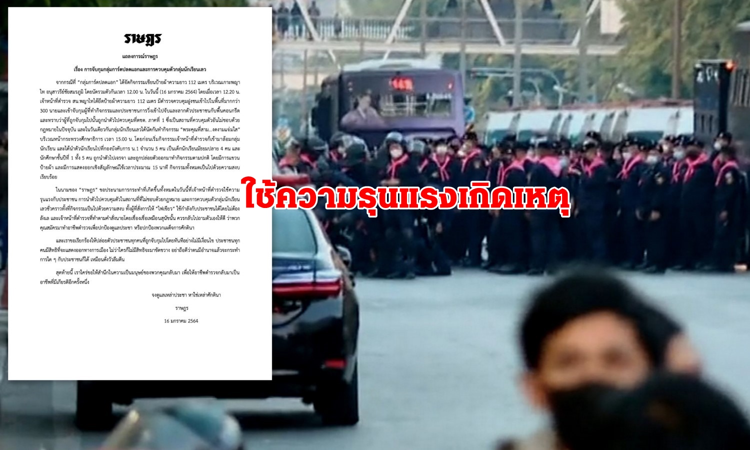 กลุ่มแนวร่วมธรรมศาสตร์และการชุมนุม ออกแถลงการณ์ของราษฎร ประนามการใช้ความรุนแรงของเจ้าหน้าที่ตำรวจ กรณีกลุ่มการ์ดปลดแอก จัดกิจกรรมเขียนป้ายความนยาว 112เมตร ที่อนุสาวรีชัยสมรภูมิ เมื่อเวลา 12.00น.ที่ผ่านมา และถูกจับกุมไปที่ตชด.ภาค1 ขณะที่กลุ่มนักเรียนเลว นัดทำกิจกรรม บริเวณหน้ากระทรวงศึกษาธิการ เมื่อเวลา 15.00น.ซึ่งก่อนเริ่มกิจกรรม เจ้าหน้าที่ตำรวจเข้าปิดล้อมและคุมตัวนักเรียนจำนวน 5คนไปที่กองบังคับการตำรวจนครบาล1 ก่อนที่จะถูกปล่อยตัวออกมาทำกิจกรรมตามปกติ และขอเรียกร้องให้ปล่อยตัวประชาชนที่ถูกจับกุมไปโดยทันทีอย่างไม่มีเงื่อนไข เพราะทุกคนมีสิทธิแสดงออกทางการเมือง