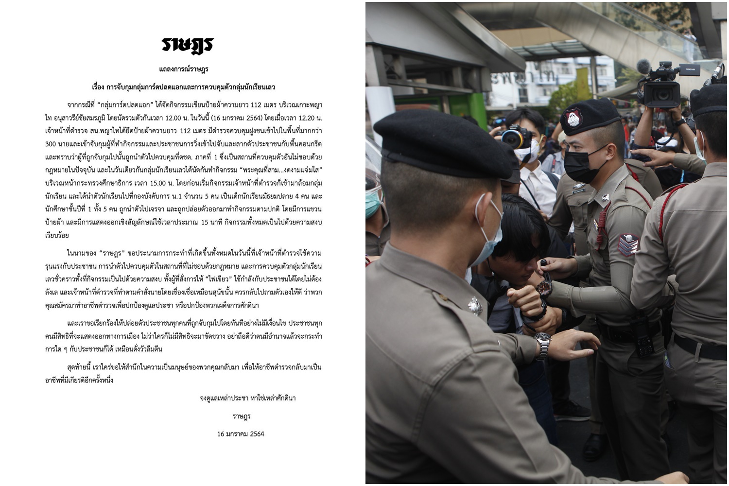 เพจแนวร่วมธรรมศาสตร์และการชุมนุม เผยแพร่แถลงการณ์ของกลุ่มราษฎร เรื่อง การจับกุมกลุ่มการ์ดปลดแอกและการควบคุมตัวกลุ่มนักเรียนเลว ระบุว่า จากกรณีกลุ่มการ์ดปลดแอก ได้จัดกิจกรรมเขียนป้ายผ้าความยาว 112 เมตร บริเวณเกาะพญาไท อนุสาวรีย์ชัยสมรภูมิ รวมตัวกันเวลา 12.00 น. วานนี้ (16 ม.ค.) โดยเมื่อเวลา 12.20 น. เจ้าหน้าที่ตำรวจ สน.พญาไท ได้ยึดป้ายผ้าและมีตำรวจควบคุมฝูงชนเข้าไปในพื้นที่มากกว่า 300 นาย และเข้าจับกุมผู้ที่ทำกิจกรรมและประชาชน การวิ่งเข้าไปจับและลากตัวประชาชนกับพื้นคอนกรีตและทราบว่าผู้ที่ถูกจับกุมไปนั้นถูกนำตัวไปควบคุมที่ ตชด. ภาคที่ 1 ซึ่งเป็นสถานที่ควบคุมตัวอันไม่ชอบด้วยกฎหมายในปัจจุบัน
