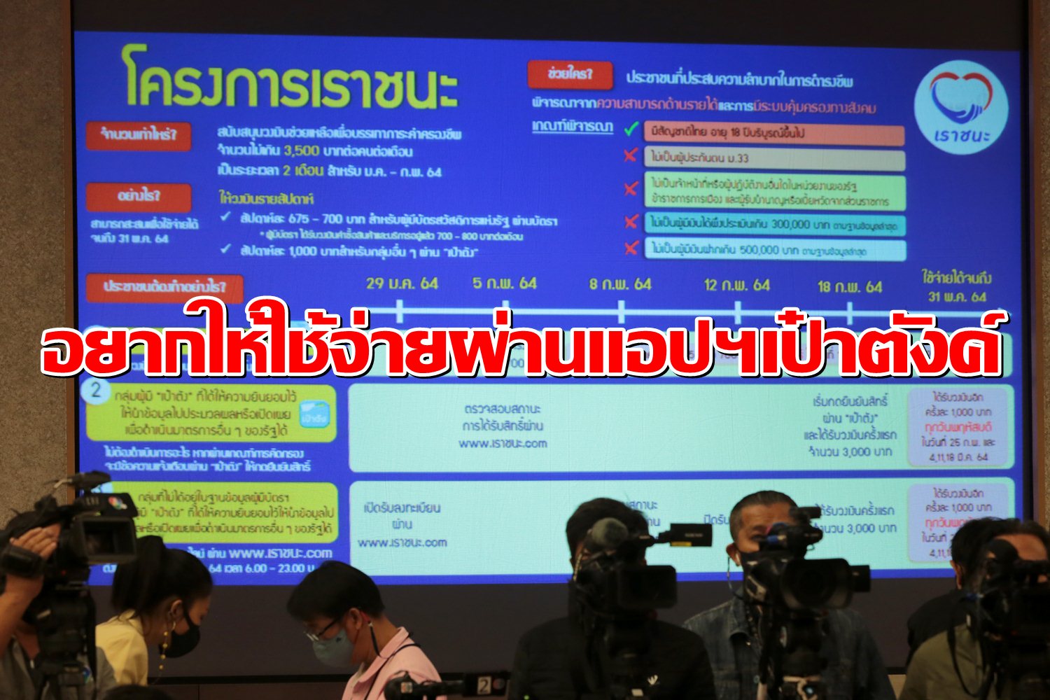 โฆษกรัฐบาลชี้แจงโครงการเราชนะไม่ให้ประชาชนเป็นเงินสด เพราะหวังให้ใช้จ่ายผ่านแอปฯเป๋าตังค์ ทำให้เกิดการกระตุ้นเศรษฐกิจในร้านค้าหาบเร่ แผงลอย ตลาดสด
