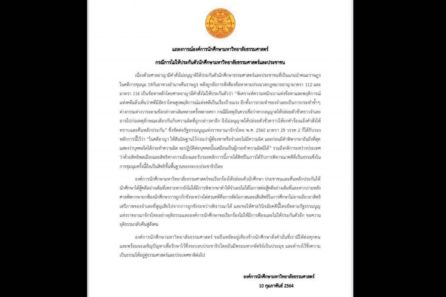 เมื่อวันที่ 10 ก.พ. องค์การนักศึกษามหาวิทยาลัยธรรมศาสตร์ ออกแถลงการณ์กรณีศาลไม่ให้ประกันตัวนักศึกษาธรรมศาสตร์และประชาชน ภายหลังศาลอาญา มีคำสั่งไม่ให้ประกันตัว 4 แกนนำกลุ่มราษฎร คือ 1.เพนกวิน-พริษฐ์ ชิวารักษ์ จากคดีจัดการชุมนุม โดยมีเนื้อหาดังนี้