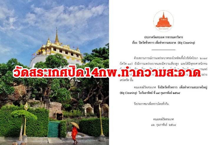 เมื่อวันที่ 13 กพ. 64 คณะสงฆ์วัดสระเกศ ประกาศเรื่อง "วัดสระเกศราชวรมหาวิหารเรื่องปิดวัดชั่วคราวเพื่อทำความสะอาด(Big cleaning) โดยระบุว่า ด้วยสถานการณ์การแพร่ระบาดของโรคโควิด-19 ยังมีการแพร่ระบาดและมีความเสี่ยงสูงและได้มีพุทธศาสนิกชนนักท่องเที่ยวเข้ามาเยี่ยมชมวัดอย่างต่อเนื่อง เพื่อเป็นการป้องกันควบคุมการแพร่ระบาดของโรคโควิด-19 และปฏิบัติตามมาตรการของกระทรวงสาธารณสุขอย่างเคร่งครัดนั้นคณะสงฆ์วัดสระเกศ จึงปิดวัดชั่วคราว เพื่อทำความสะอาดใหญ่ในวันอาทิตย์ ที่ 14 กพ. 2564 จึงประกาศมาเพื่อทราบโดยทั่วกัน