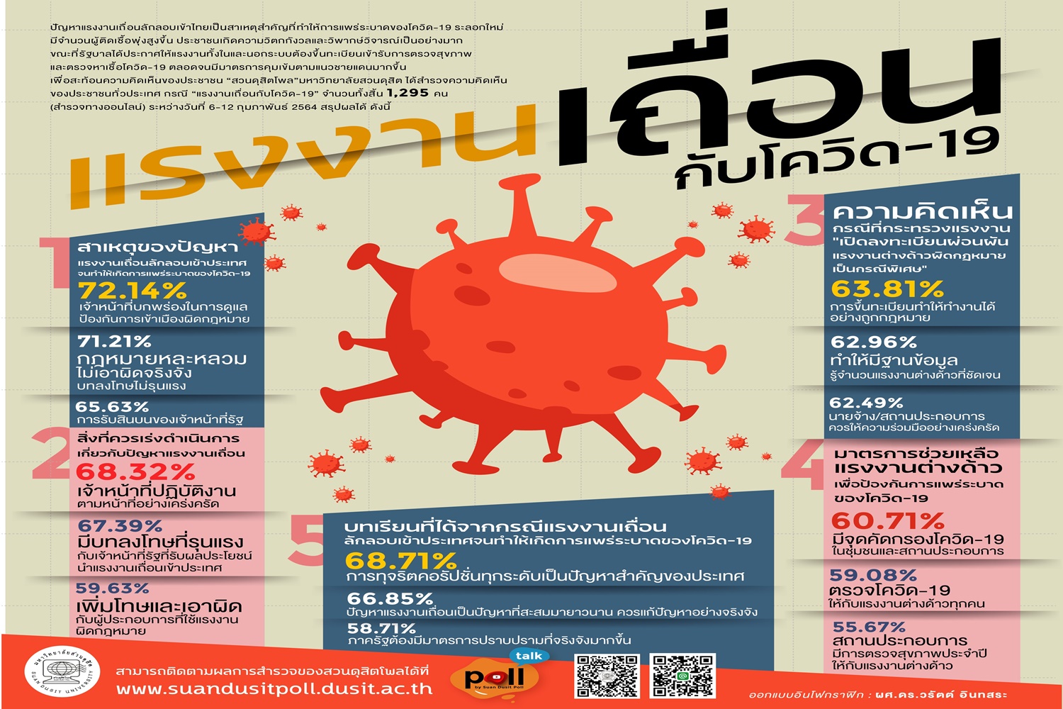 สวนดุสิตโพล มหาวิทยาลัยสวนดุสิต สำรวจความคิดเห็นของประชาชนเรื่อง “แรงงานเถื่อนกับโควิด-19” จำนวน 1,295 คน สำรวจวันที่ 6 – 12 กุมภาพันธ์ 2564 พบว่า สาเหตุของปัญหาแรงงานเถื่อนลักลอบเข้าประเทศ จนทำให้เกิดการแพร่ระบาดของโควิด-19 คือ ความบกพร่องของเจ้าหน้าที่ ร้อยละ 72.14 สิ่งที่ควรเร่งดำเนินการ คือ เจ้าหน้าที่ต้องปฏิบัติงานตามหน้าที่อย่างเคร่งครัด ร้อยละ 68.32 และเห็นว่ากรณีที่กระทรวงแรงงาน “เปิดลงทะเบียนผ่อนผันแรงงานต่างด้าว ผิดกฎหมายเป็นกรณีพิเศษ” เป็นการช่วยให้แรงงานทำงานได้อย่างถูกกฎหมาย ร้อยละ 63.81