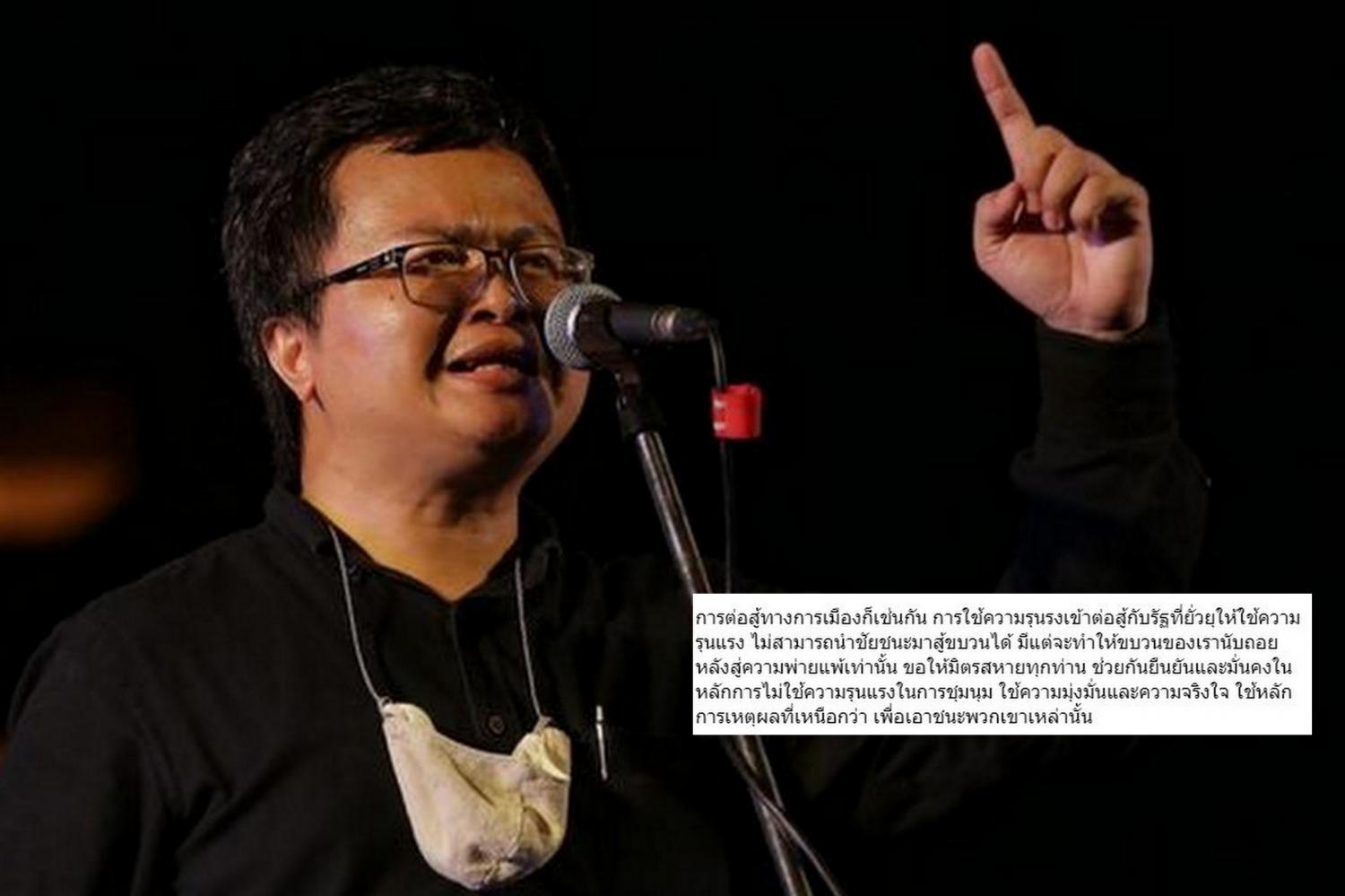 การต่อสู้ทางการเมืองก็เช่นกัน การใช้ความรุนแรงเข้าต่อสู้กับรัฐที่ยั่วยุให้ใช้ความรุนแรง ไม่สามารถนำชัยชนะมาสู้ขบวนได้ มีแต่จะทำให้ขบวนของเรานับถอยหลังสู่ความพ่ายแพ้เท่านั้น ขอให้มิตรสหายทุกท่าน ช่วยกันยืนยันและมั่นคงในหลักการไม่ใช้ความรุนแรงในการชุมนุม ใช้ความมุ่งมั่นและความจริงใจ ใช้หลักการเหตุผลที่เหนือกว่า เพื่อเอาชนะพวกเขาเหล่านั้น