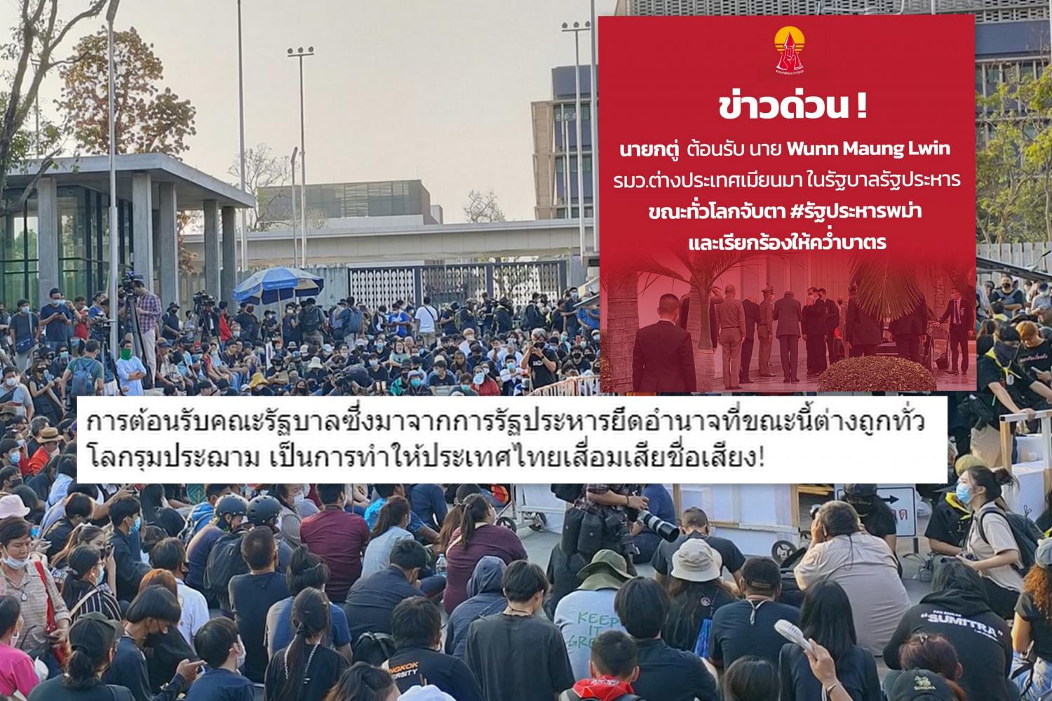 เพจฯกลุ่มผู้ชุมนุมราษฎร ระบุว่า "วันนี้ปรากฏภาพ ประยุทธ์ จันทร์โอชา ต้อนรับนาย Wunn Maung Lwin รมว.ต่างประเทศเมียนมาร์ ในคณะรัฐบาลเมียนมาร์ ณ ห้องรับรอง กองบิน 6 (บน.6) ดอนเมือง