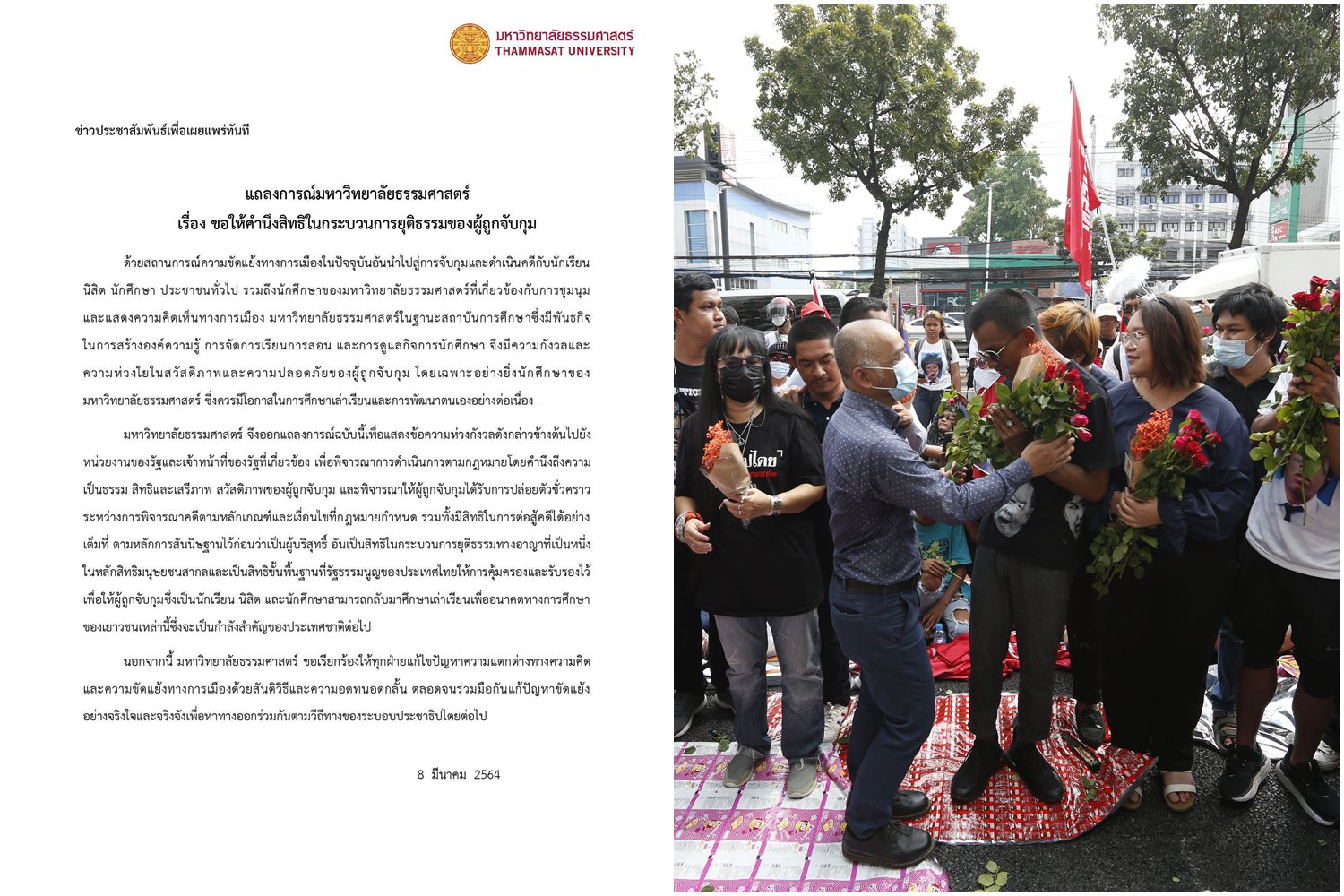 เมื่อวันที่ 8 มี.ค. 64 เพจเฟซบุ๊กมหาวิทยาลัยธรรมศาสตร์ "Thammasat University" ได้เผยแพร่ แถลงการณ์มหาวิทยาลัยธรรมศาสตร์ เรื่อง ขอให้คำนึงสิทธิในกระบวนการยุติธรรมของผู้ถูกจับกุม โดยมีใจความสำคัญคือ มหาวิทยาลัยธรรมศาสตร์มีความห่วงใยในสวัสดิภาพและความปลอดภัยของผู้ถูกจับกุมที่เกี่ยวข้องกับการชุมนุมและแสดงความเห็นทางการเมือง โดยเฉพาะอย่างยิ่งนักศึกษาของมหาวิทยาลัยธรรมศาสตร์ ที่ควรมีโอกาสในการศึกษาเล่าเรียนและการพัฒนาตนเองอย่างต่อเนื่อง