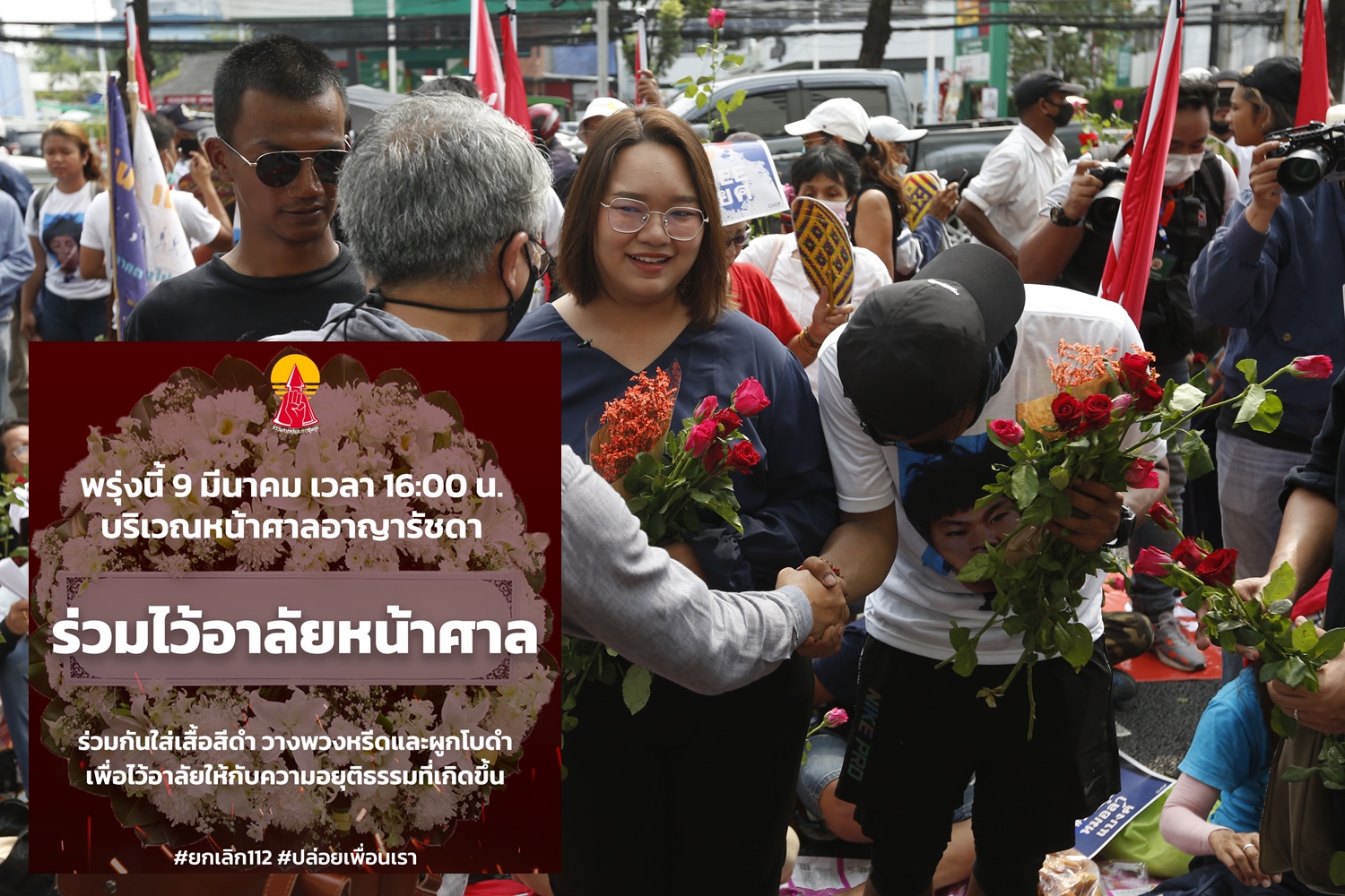กลุ่มแนวร่วมธรรมศาสตร์และการชุมนุม ได้ประกาศนัดมวลชนไปรวมตัวหน้า ศาลอาญาในวันที่ 9 มี.ค. 64 เวลา 16.00 น. พร้อมให้มวลชนร่วมใส่เสื้อสีดำ และร่วมกันวางพวงหรีดและผูกโบว์ดำเพื่อไว้อาลัยให้กับความอยุติธรรม