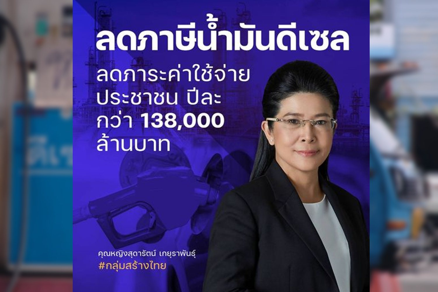 "คุณหญิงสุดารัตน์" เผยข้อเสนอ "กลุ่มสร้างไทย" ให้รัฐบาลลดภาษีน้ำมันดีเซลที่เก็บอยู่ 5.9 บาทต่อลิตร เพื่อลดภาระค่าใช้จ่ายให้กับประชาชน