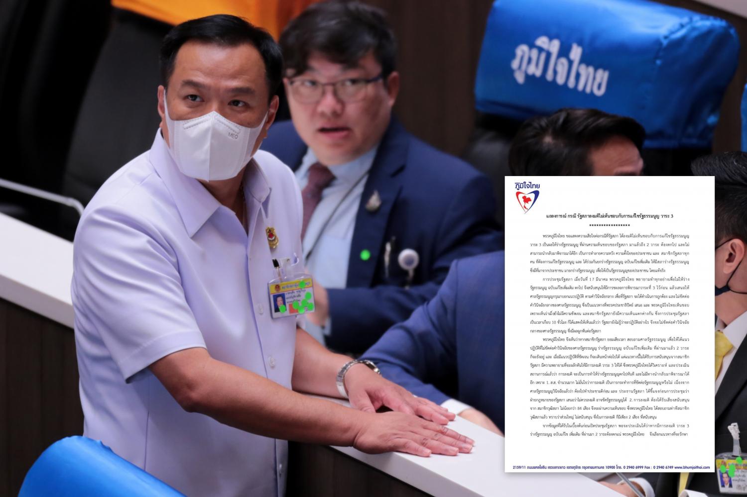 เมื่อวันที่ 18 มี.ค. นายอนุทิน ชาญวีรกูล รองนายกรัฐมนตรี และ รมว.สาธารณสุข ในฐานะหัวหน้าพรรคภูมิใจไทย ออกแถลงการณ์กรณีรัฐสภาลงมติไม่เห็นชอบกับการแก้ไขรัฐธรรมนูญ วาระ 3 โดยมีเนื้อหาดังนี้