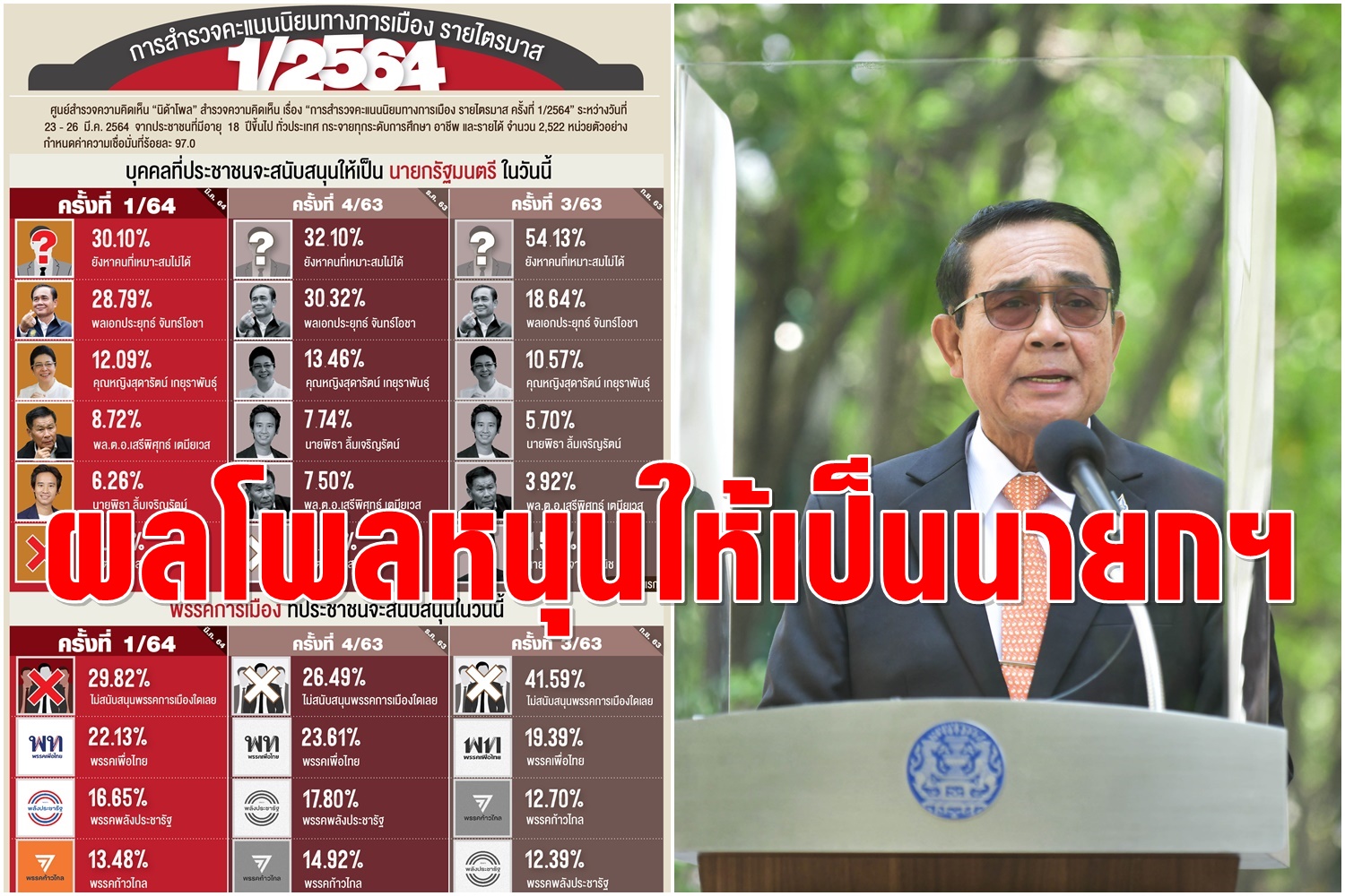 ศูนย์สำรวจความคิดเห็น “นิด้าโพล” สถาบันบัณฑิตพัฒนบริหารศาสตร์ (นิด้า) เปิดเผยผลสำรวจของประชาชน เรื่อง “การสำรวจคะแนนนิยมทางการเมือง รายไตรมาส ครั้งที่ 1/2564” ทำการสำรวจระหว่างวันที่ 23 – 26 มีนาคม 2564 จากประชาชนที่มีอายุ 18 ปีขึ้นไป กระจายทุกภูมิภาค ระดับการศึกษา และอาชีพทั่วประเทศ รวมทั้งสิ้น จำนวน 2,522 หน่วยตัวอย่าง เกี่ยวกับการสำรวจคะแนนนิยมทางการเมือง