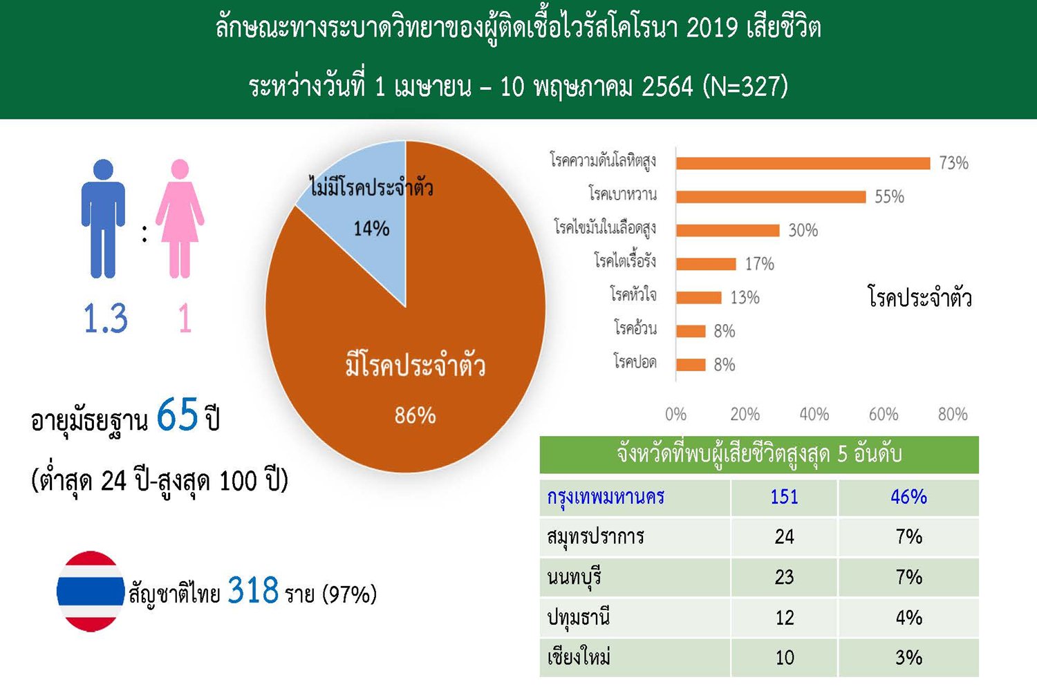 โฆษกศบค.กล่าวอีกว่า สำหรับจังหวัดที่พบผู้เสียชีวิตสูงสุด 5 อันดับ อันดับ 1 กทม. ผู้เสียชีวิต 151 ราย คิดเป็น 46% สมุทรปราการ 24 ราย 7% นนทบุรี 23 ราย 7% ปทุมธานี 12 ราย 4% และเชียงใหม่ 10ราย 3%