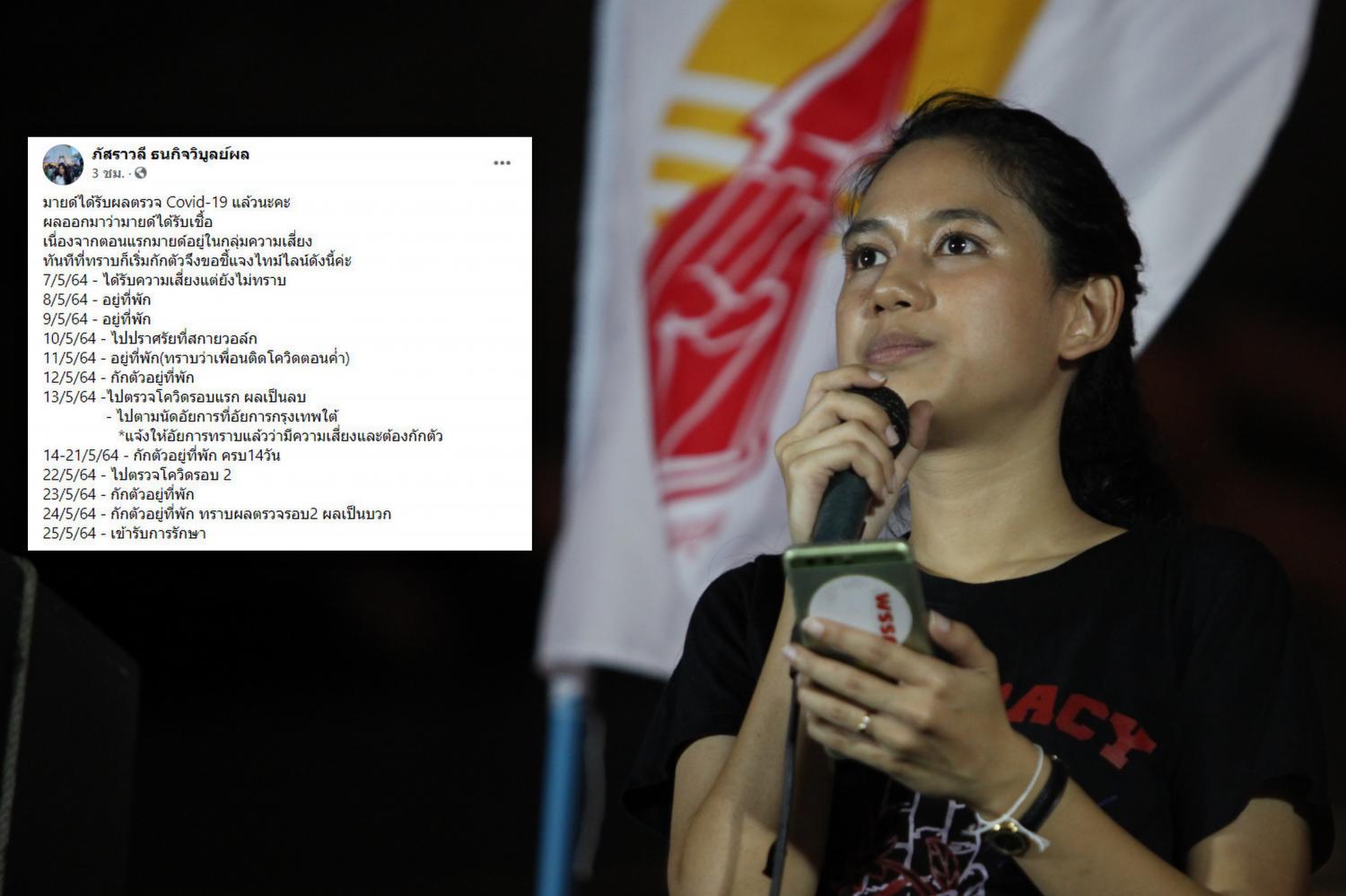 เมื่อวันที่ 25 พ.ค. มายด์-ภัสราวลี ธนกิจวิบูลย์ผล หนึ่งในแกนนำกลุ่มราษฎร โพสต์เฟซบุ๊กเปิดเผยว่าติดเชื้อโควิด-19 พร้อมเปิดเผยรายละเอียดไทม์ไลน์ตั้งแต่เมื่อวันที่ 7 พ.ค.ที่ผ่านมา