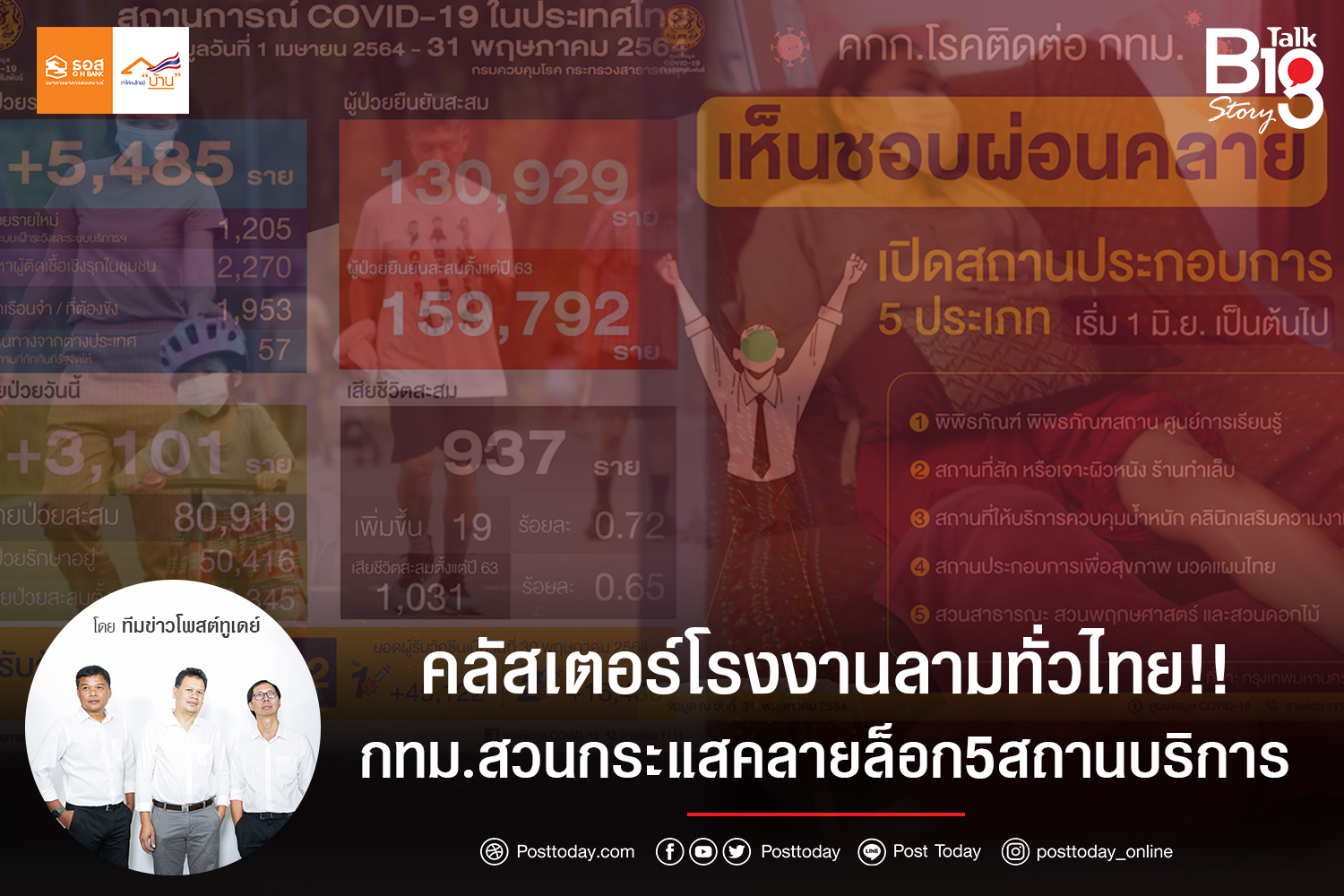 ยอดติดเชื้อโควิดทำนิวไฮทะลุกว่า 5 พันรายภายในวันเดียว ถือเป็นยอดติดเชื้อรายวันสูงที่สุดในการระบาดละลอกใหม่ อีกทั้งพบคลัสเตอร์ใหม่ในโรงงานกระจายตัวไปอีกหลายจังหวัด ไม่รวมเรือนจำ แต่กทม.กลับประกาศคลายล็อก 5 สถานประกอบกิจการให้เปิดได้เริ่มตั้งแต่ 1 มิ.ย.เป็นต้นไป ทำให้เกิดข้อสงสัยแล้วจะคุมสถานการณ์ไหวหรือ!!!