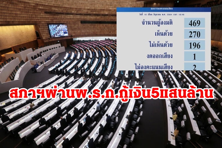 เมื่อวันที่ 10 มิ.ย. 64 ที่ประชุมสภาผู้แทนราษฎร ลงมติรับ พ.ร.ก.ให้อำนาจกระทรวงการคลังกู้เงินเพื่อแก้ไขปัญหาเศรษฐกิจและสังคมจากการระบาดของโรคติดเชื้อไวรัสโคโรนา 2019 เพิ่มเติม วงเงินไม่เกิน 500,000 ล้านบาท ด้วยคะแนนเสียง 270 ไม่เห็นด้วย 196 เสียง งดออกเสียง 1 เสียง ไม่ลงคะแนน 2 เสียง จากจำนวนผู้ลงมติ 469 คน