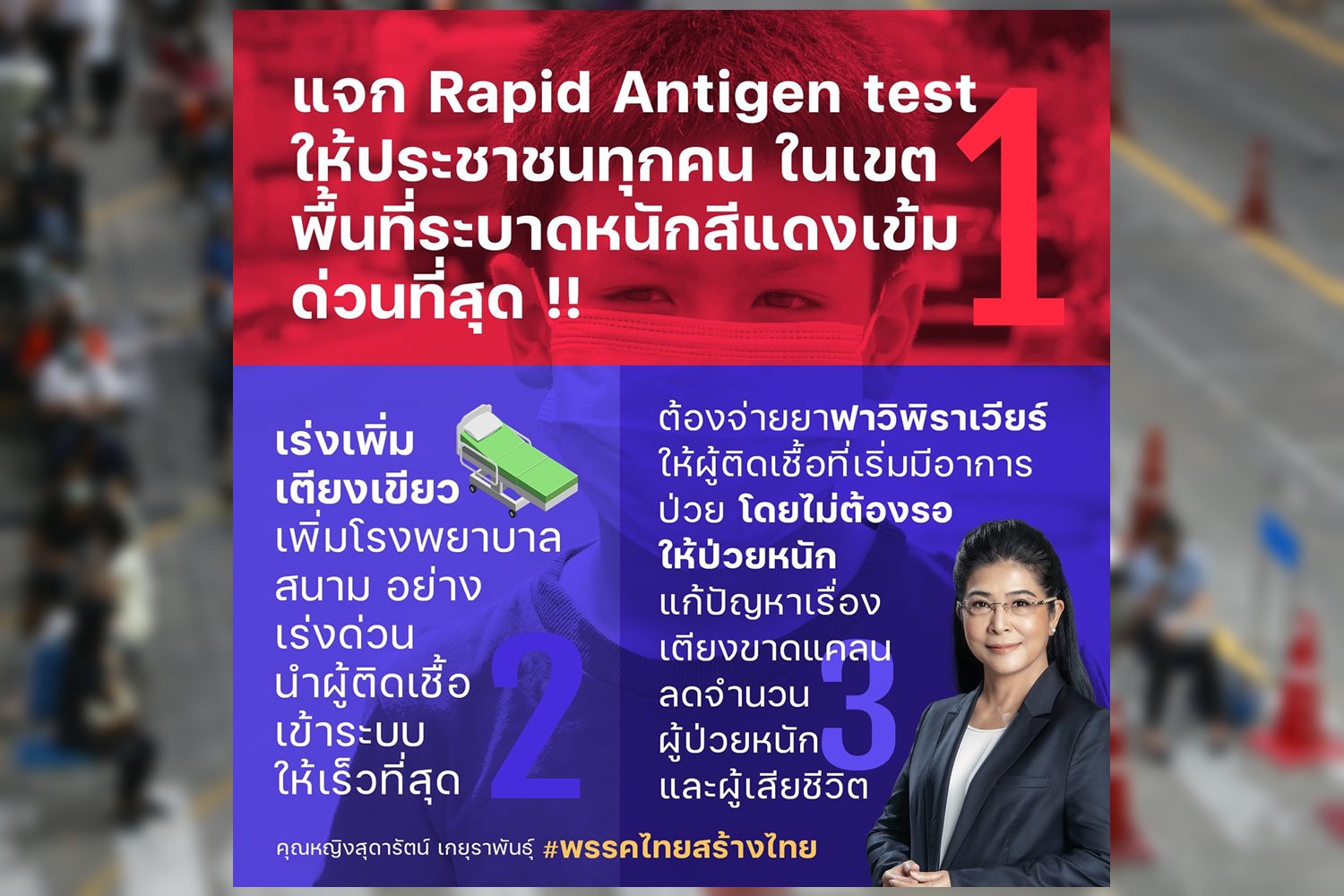 สุดารัตน์จี้รัฐบาลเร่งแจก "Rapid Antigen test" ให้ประชาชนทุกคนในพื้นที่ระบาดหนัก เร่งเพิ่มเตียงรักษา จ่ายยาฟาวิพิราเวียร์ให้ผู้เริ่มมีอาการป่วยโดยไม่ต้องรอให้ป่วยหนัก