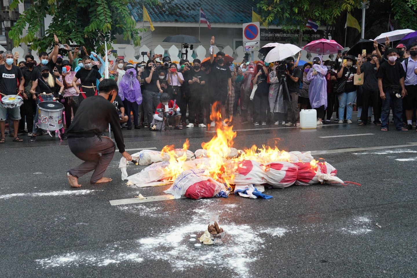 กลุ่มทะลุฟ้าได้มีการเผาหุ่นจำลอง 3 ป. โดยนำเทียนพรรษาที่หล่อขึ้นมาเป็นต้นเพลิงและมีการหยดน้ำตาเทียนลงบนหุ่นเพื่อสะท้อนการบริหารงานที่ล้มเหลวของรัฐบาลทำให้ประชาชนต้องสูญเสียน้ำตา จากนั้นมวลชนได้ร่วมกันเปล่งเสียง "ประยุทธ์ออกไป" และทำกิจกรรมร่วมกัน ก่อนจะมีการประกาศยุติการชุมนุม