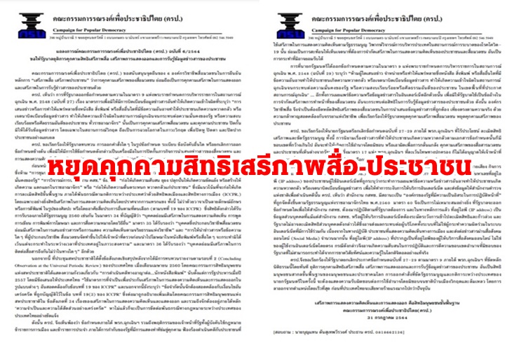 ดังนั้น ครป. จึงเห็นพ้องว่า ข้อกำหนดภายใต้ พรก.ฉุกเฉินฯ รวมถึงพฤติกรรมของเจ้าหน้าที่รัฐทั้งผู้บังคับใช้กฎหมาย ข้าราชการการเมือง และข้าราชการประจำ ภายใต้การกำกับของรัฐที่มีการแสดงท่าทีข่มขู่คุกคาม ฟ้องร้องดำเนินคดีกับประชาชนที่ใช้เสรีภาพในการแสดงความคิดเห็นตามรัฐธรรมนูญ วิพากษ์วิจารณ์การบริหารประเทศในสถานการณ์การระบาดของโรคโควิด-19 นั้น ย่อมเป็นการสะท้อนให้เห็นเจตนาที่ต้องการจำกัดเสรีภาพในการแสดงความคิดเห็นของประชาชนและสื่อมวลชน อันเป็นการกระทำที่มิอาจยอมรับได้