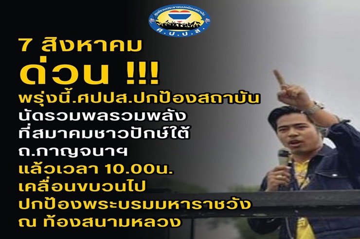 ศปปส.ประกาศนัดรวมพล 7 ส.ค. มุ่งหน้าท้องสนามหลวง ปกป้องพระบรมมหาราชวัง หลังจากม็อบเยาวชนปลดแอกนัดชุมนุม