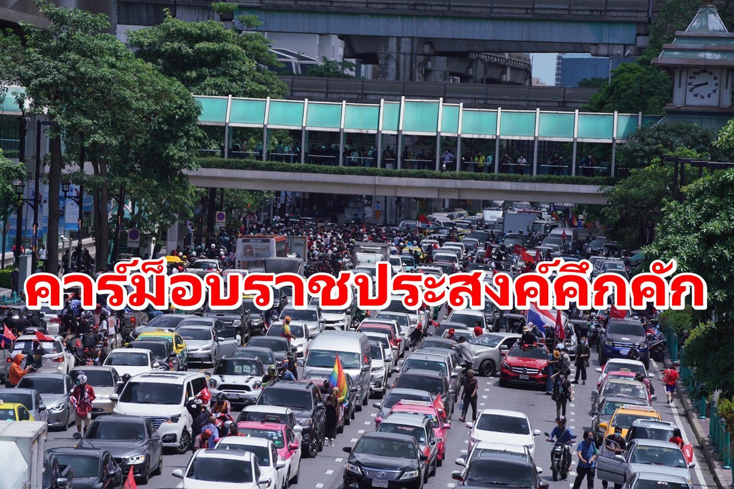 บรรยากาศคาร์ม็อบ 10 สิงหา คึกคัก มวลชนทยอยนำยานพาหนะมารวมตัวกันที่แยกราชประสงค์ก่อนเริ่มเคลื่อนขบวนไปตามถนนสุขุมวิท