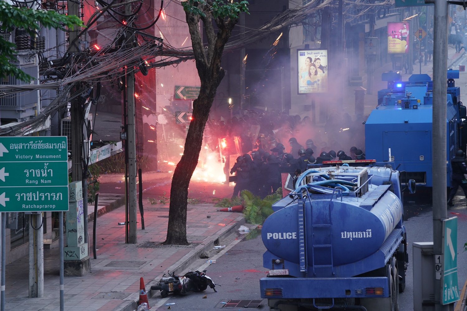 ขณะที่เจ้าหน้าที่ตำรวจได้ยิงกระสุนยาง และแก๊สน้ำตา เข้าใส่กลุ่มผู้ชุมนุม รวมทั้งใช้รถฉีดน้ำแรงดันสูงเข้าฉีดใส่