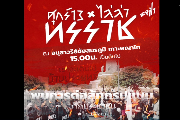 เพจเฟซบุ๊ก ทะลุฟ้า - thalufah ประกาศ นัด รวมพล ! ศุกร์ 13 ไล่ล่าทรราช #ม็อบ13สิงหา อนุสาวรีย์ชัยสมรภูมิ ฝั่งเกาะพญาไท 15.00น เป็นต้นไป เราจะเดินคล้องแขนไปบ้านประยุทธ์พบการต่อสู้ทุกรูปแบบจากประชาชน แม้การต่อสู้ครั้งที่ผ่านมาคนเราจะน้อยและพวกเราทะลุฟ้า จะยังอยู่แค่จุดเริ่มต้นเพราะตำรวจควบคุมฝูงชนเข้ามาสลายการชุมนุมอย่างป่าเถื่อนเยี่ยงอสุร้ายในกายคนเพื่อปกป้องพวกทรราช