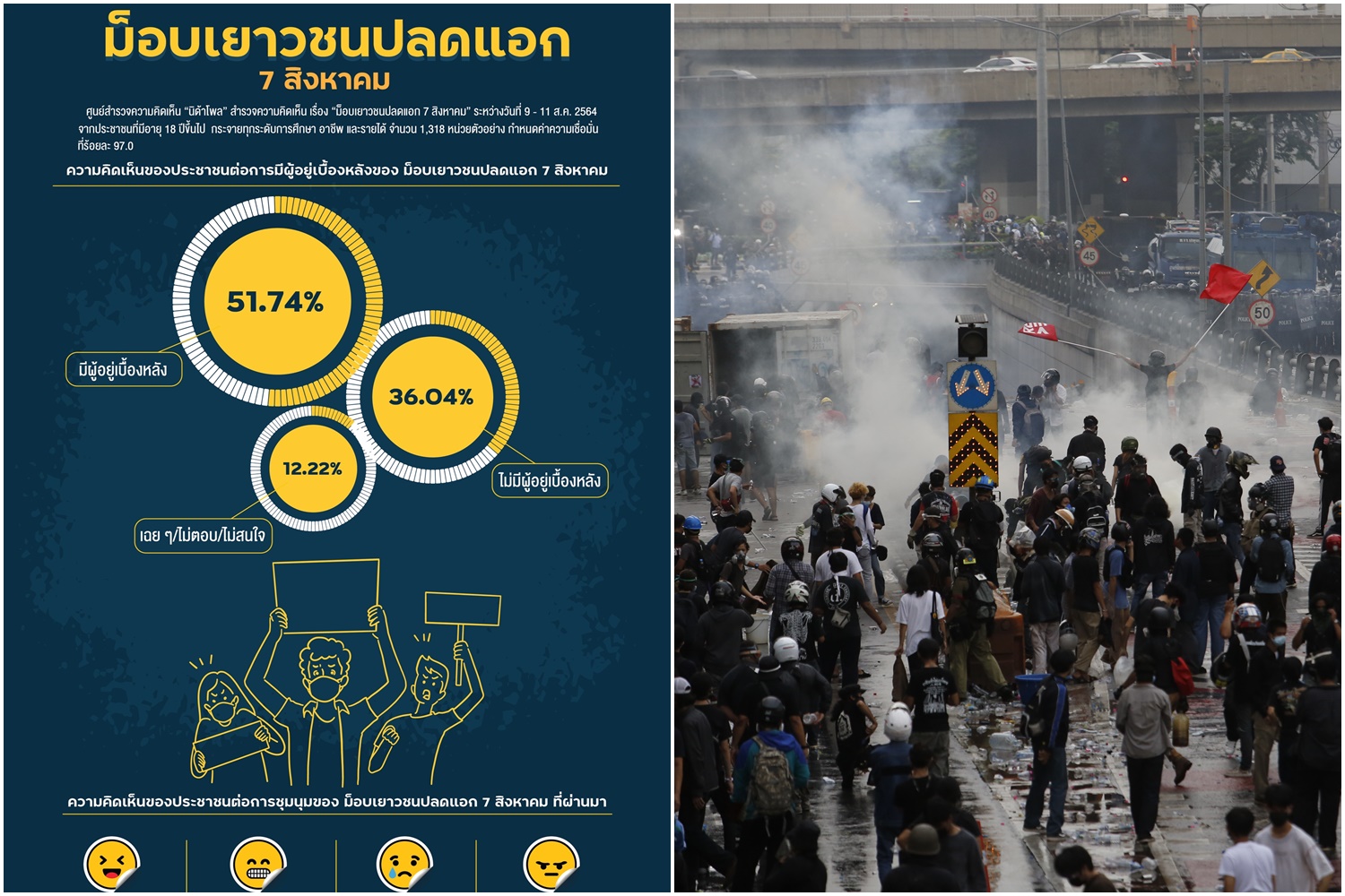 จากการสำรวจเมื่อถามถึงความคิดเห็นของประชาชนต่อการมีผู้อยู่เบื้องหลังของ ม็อบเยาวชนปลดแอก 7 สิงหาคม พบว่า ส่วนใหญ่ ร้อยละ 51.74 ระบุว่า มีผู้อยู่เบื้องหลัง ขณะที่ ร้อยละ 36.04 ระบุว่า ไม่มีผู้อยู่เบื้องหลัง และร้อยละ 12.22 ระบุว่า เฉย ๆ/ไม่ตอบ/ไม่สนใจ
