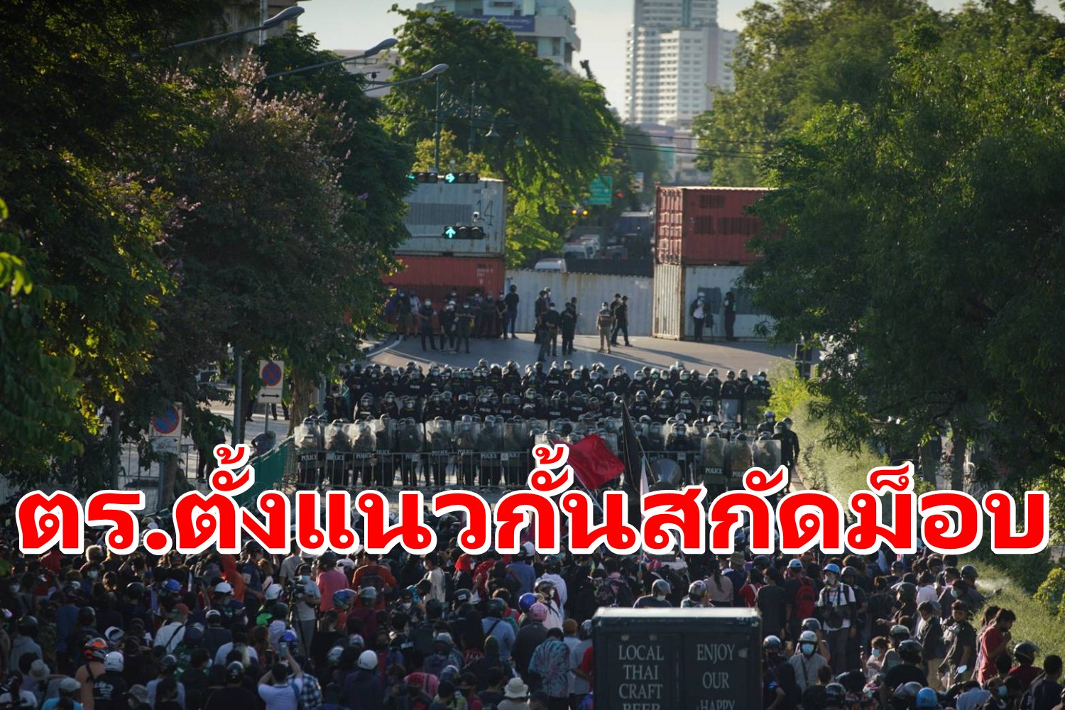 ขณะที่เจ้าหน้าที่ตำรวจได้มีการยกตู้เทนเนอร์เข้ามาเสริมแนวกั้นเพิ่มเติม