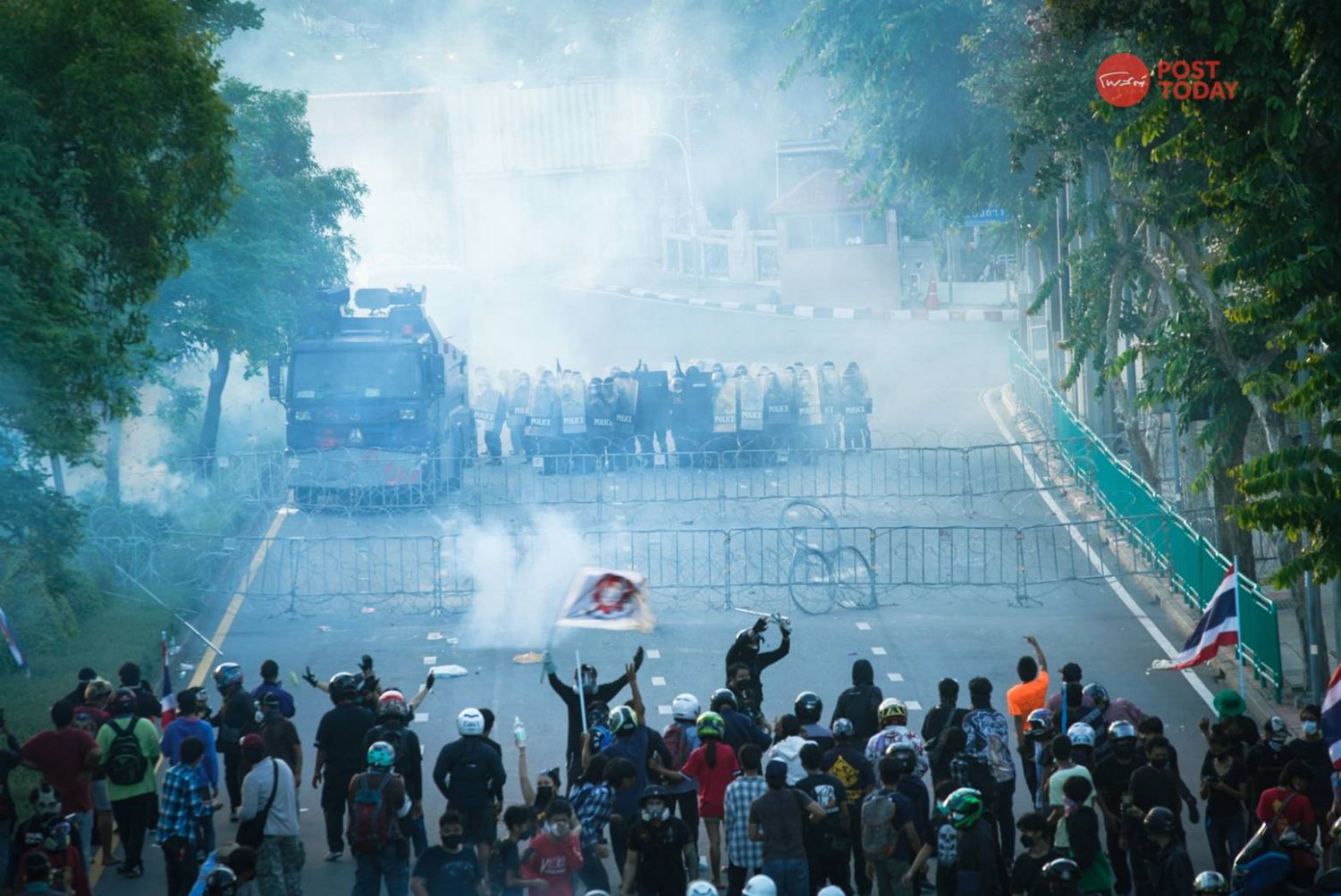 จากนั้นมวลชนบางส่วนได้เริ่มจุดประทัดขว้างเข้าใส่แนวกั้นเจ้าหน้าที่ตำรวจ ส่งผลให้เจ้าหน้าที่ใช้แก๊สน้ำตาตอบโต้