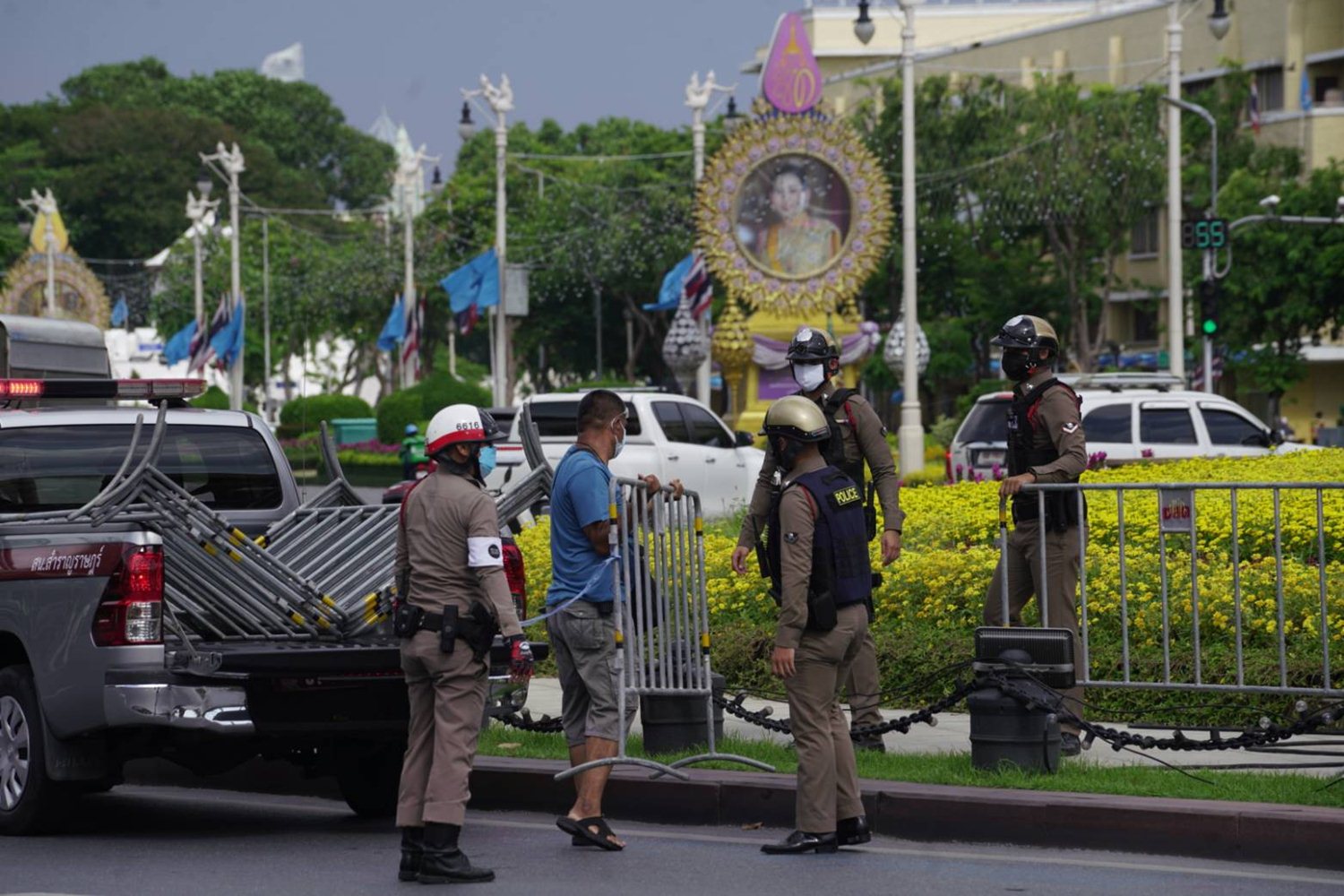 ด้านเจ้าหน้าที่ตำรวจได้เข้าวางแผงเหล็กกั้นตลอดแนวริมถนนรอบอนุสาวรีย์ประชาธิปไตยเพื่อป้องกันไม่ให้ผู้ชุมนุมเข้าไปบริเวณอนุสาวรีย์