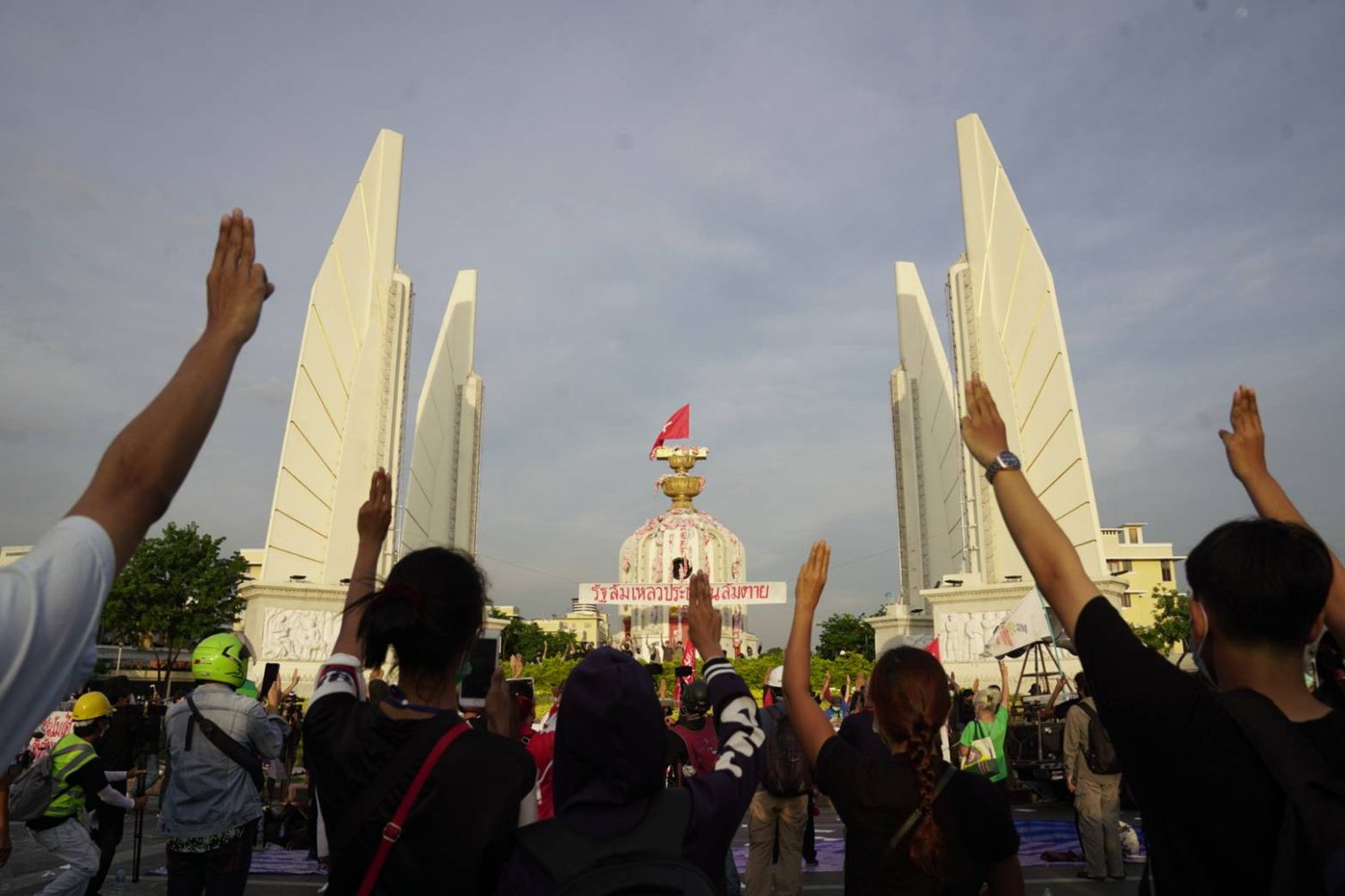 ม็อบทะลุฟ้าที่อนุสาวรีย์ประชาธิปไตยจัดกิจกรรมปราศรัย และชู3นิ้วเคารพธงชาติ พร้อมยืนสงบนิ่งไว้อาลัยผู้เสียชีวิตจากโควิด พร้อมปักธงแดงเรียกร้องสหประชาชาติมาช่วยไทย