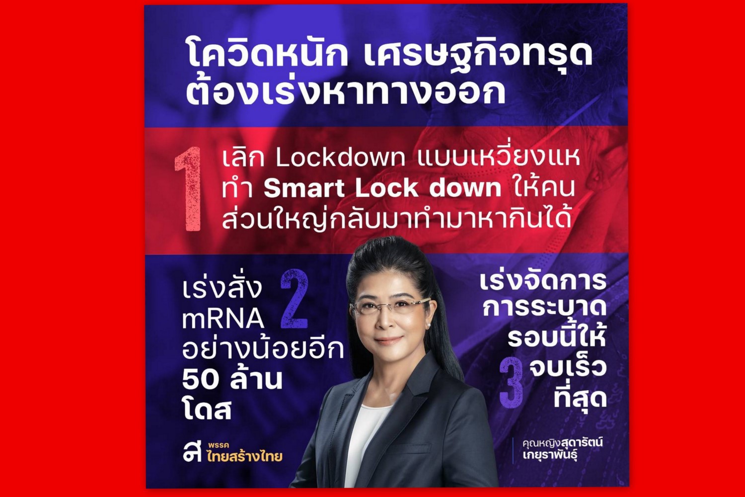 "สุดารัตน์"ซัดรัฐบาล โควิดยอดผู้ติดเชื้อทะลุ1ล้าน เสียชีวิตกว่า8,500 ถึงเวลาหยุดผลักภาระให้ประชาชน จี้รับผิดชอบทุกความสูญเสีย เสนอ3ทางแก้เลิก Lockdown เร่งหาวัคซีน mRNAสั่ง ATK แจกพื้นที่แดงเข้ม