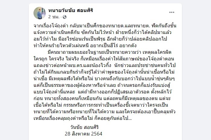 เมื่อวันที่ 28 สิงหาคม 2564 นายวันชัย สอนศิริ สมาชิกวุฒิสภาเขียนข้อความในเพจเฟซ บุ๊คส่วนตัว ว่า