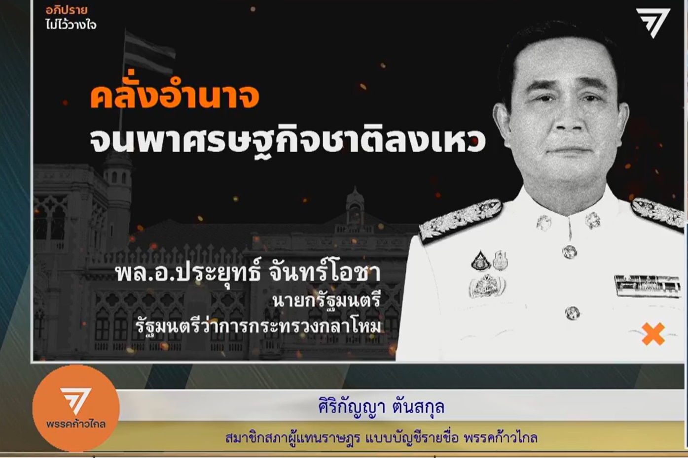 นางสาวศิริกัญญา ตันสกุล สส.บัยชีรายชื่อ พรรคก้าวไกล กล่าวอภิปรายไม่ไว้วางใจ พล.อ.ประยุทธ์ จันทร์โอชา นายกรัฐมนตรี และ รมว.กลาโหม ว่า เป็นผู้คลั่งอำนาจจนพาเศรษฐกิจชาติลงเหว โดยนิเคอิเอเชียจัดอันดับให้เศรษฐกิจไทยฟื้นตัวช้าที่สุดในโลก อยู่อันดับที่ 120