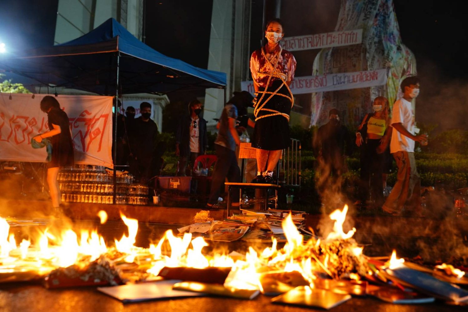 ม็อบทะลุฟ้าโปรยใบปลิวความล้มเหลวของรัฐบาลจากอนุสาวรีย์ประชาธิปไตย ขณะที่กลุ่มนักเรียนเลวมัดตัวเองกับเก้าอี้พร้อมเผาหนังสือสะท้อนการศึกษาไทยล้มเหลว