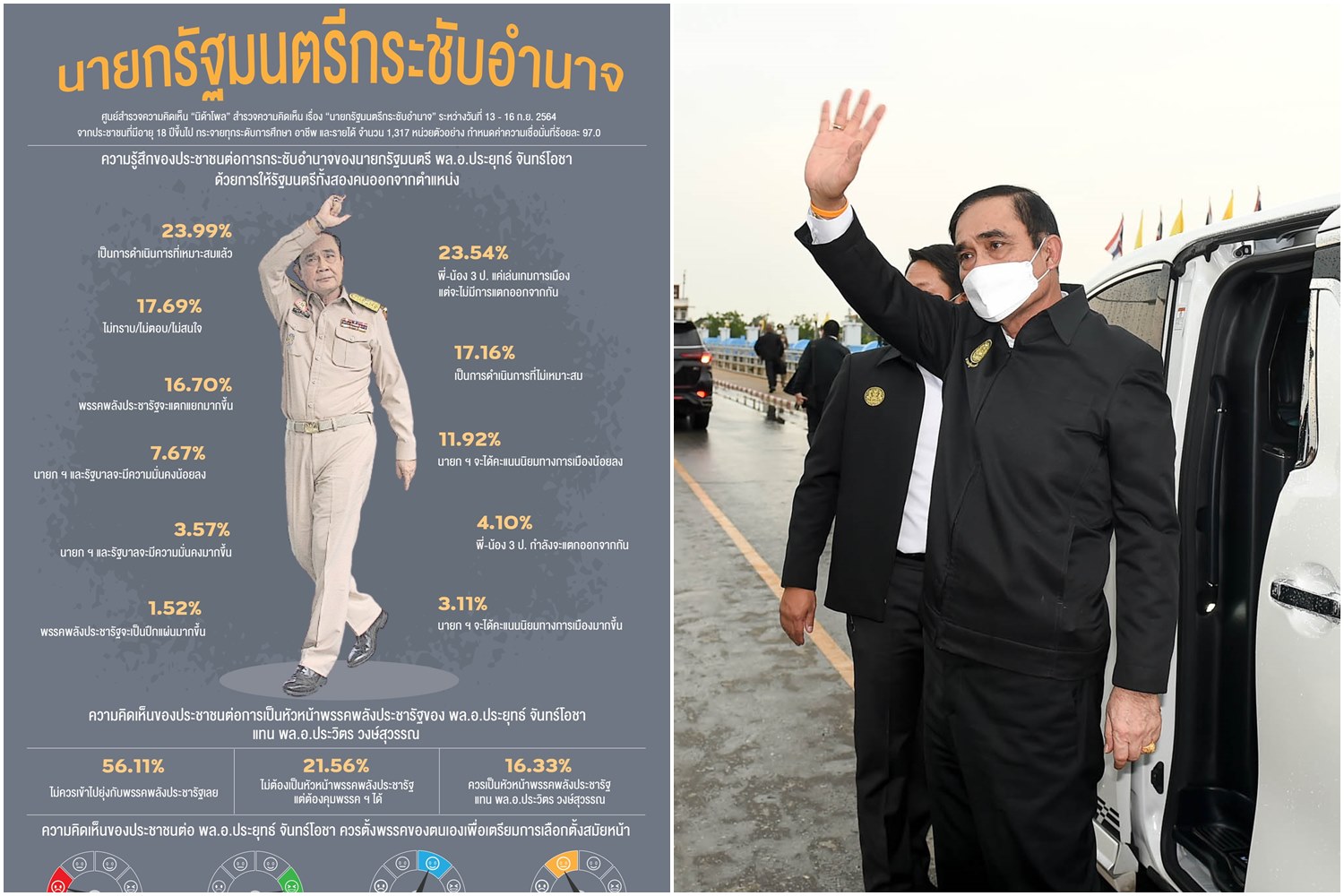 ด้านความคิดเห็นของประชาชนต่อการเป็นหัวหน้าพรรคพลังประชารัฐของ พล.อ.ประยุทธ์ จันทร์โอชา แทน พล.อ.ประวิตร วงษ์สุวรรณ พบว่า ส่วนใหญ่ ร้อยละ 56.11 ระบุว่า ไม่ควรเข้าไปยุ่งกับพรรคพลังประชารัฐเลย รองลงมา ร้อยละ 21.56 ระบุว่า ไม่ต้องเป็นหัวหน้าพรรคพลังประชารัฐ แต่ต้องคุมพรรค ฯ ได้ ร้อยละ 16.33 ระบุว่า ควรเป็นหัวหน้าพรรคพลังประชารัฐแทน พล.อ.ประวิตร วงษ์สุวรรณ และร้อยละ 6.00 ระบุว่า ไม่ทราบ/ไม่ตอบ/ไม่สนใจ