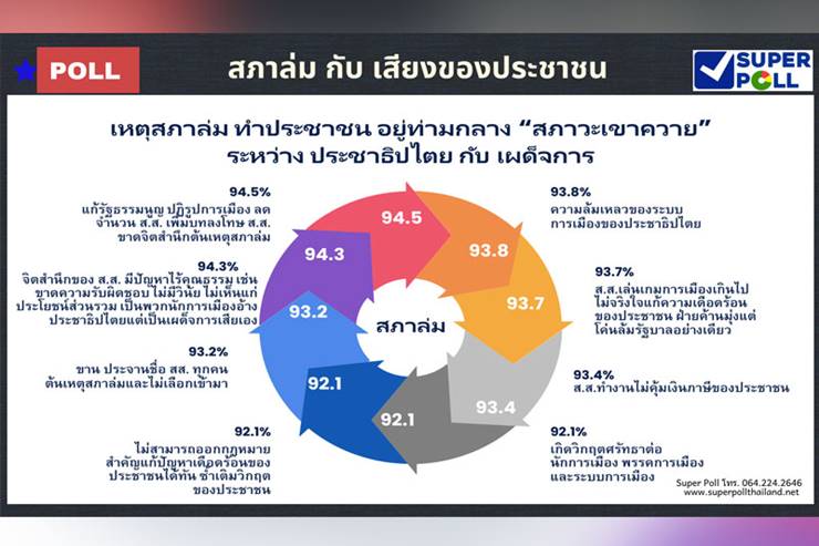 ผอ.ซูเปอร์โพล กล่าวว่า ผลโพลนี้สะท้อนให้เห็นเป็นกระจกบานใหญ่ทางการเมืองว่า การปฏิรูปการเมืองครั้งใหญ่ จำเป็นต้องเกิดขึ้น จะจากสำนึกของพรรคการเมืองและนักการเมืองเอง หรือ จากประชาชนและทุกภาคส่วนของประชาสังคมกดดัน เพราะถือว่าการเมืองเป็นพลังอำนาจของชาติหลัก ที่ยังอ่อนแอและเป็นปัญหาต่อการพัฒนาประเทศ โดยประชาชนส่วนใหญ่มองการทำหน้าที่ของ ส.ส. ต้นเหตุสภาล่มว่า เป็นวิกฤตศรัทธาของการเมืองในวิถีประชาธิปไตย ที่ไม่เห็นหัวและให้ความสำคัญถึงความเดือดร้อนทุกข์ยากของประชาชน โดยเฉพาะในช่วงวิกฤตโควิดและเศรษฐกิจ ซึ่ง ส.ส. และ พรรคการเมือง ต่างมุ่งแก่งแย่งช่วงชิงอำนาจ ผลประโยชน์ ต่อรอง และโค่นล้มรัฐบาล เพื่อหาทางเข้าสู่อำนาจ ครอบครองและต่อรองผลประโยชน์ส่วนตัวและพวกพ้อง จนเกิดวิกฤตศรัทธาและความเสื่อมถอยในระบอบประชาธิปไตย